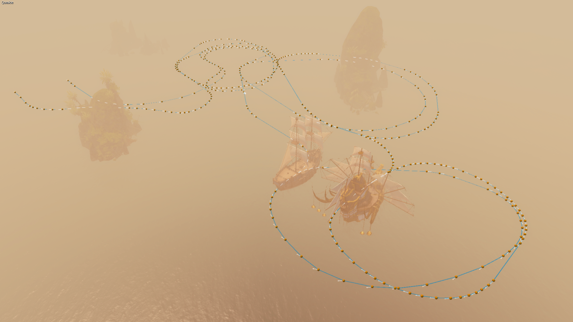 However, for anything else that needs to move with the ships—such as NPCs—a little more legwork is required. The moving platform must be specifically referenced on their spawn objects so the game engine knows to spawn them on the ship rather than floating in midair or snapping to the terrain below. With that in place, everything associated with the ships—the NPCs, the launch pads, the magic orbs, the enemy spawns, the ratlines to climb to the crow's nest—moves with them as a group and can be placed where the ships initially start out, even if they are meant to spawn later along the route.