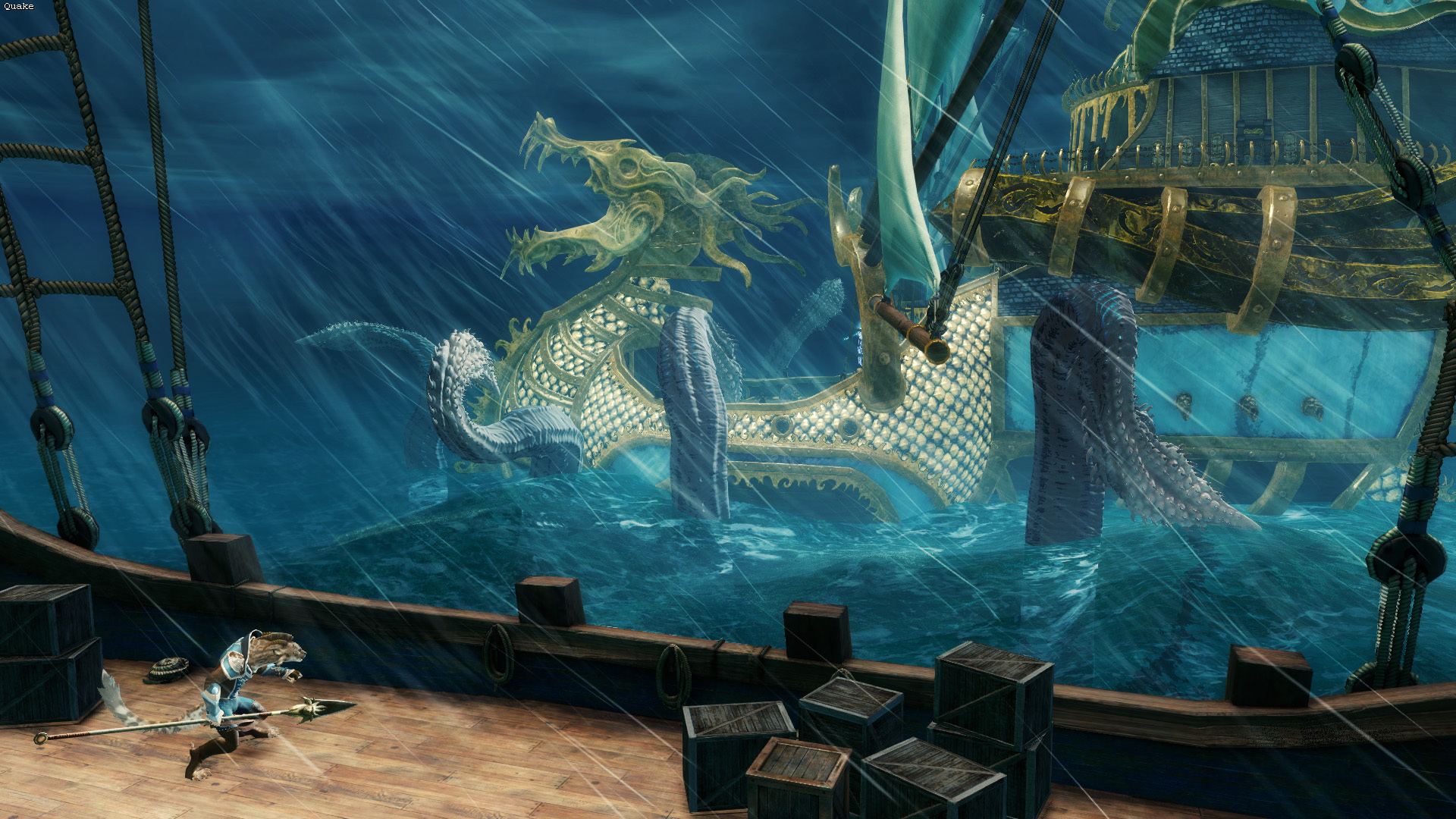The storm section opens on a black screen with dialogue in the background as the commander emerges from their cabin on the Dark Leviathan. Story designers need to consider both the design of individual story sections and how different parts of the story flow between each other. The player enters the instance from Lion's Arch, and jumping directly to the middle of the ocean would be abrupt, so I wanted to make sure this transition felt natural by setting the stage with dialogue, sound effects, and a visual transition before setting the player loose.