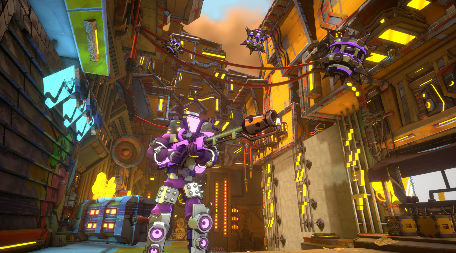 Mubel is the name of the vibrant city we’re creating for the game. Undoubtedly, it’s going to be packed full of vivid colour, high energy, enemies to obliterate, and mesmerising levels to charge through. Over the past couple of years, our dev team have truly evolved the GUN JAM environment into a sci-fi fantasy, comic punk-themed playground.