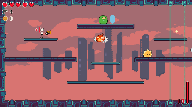 The happy flying-bot looks deceptively slow at first glance, but with each hit it takes, it becomes faster (and angrier). You can't really tell from this gif but at its fastest the flying-bot is even faster than the player, making it the fastest enemy in the game.