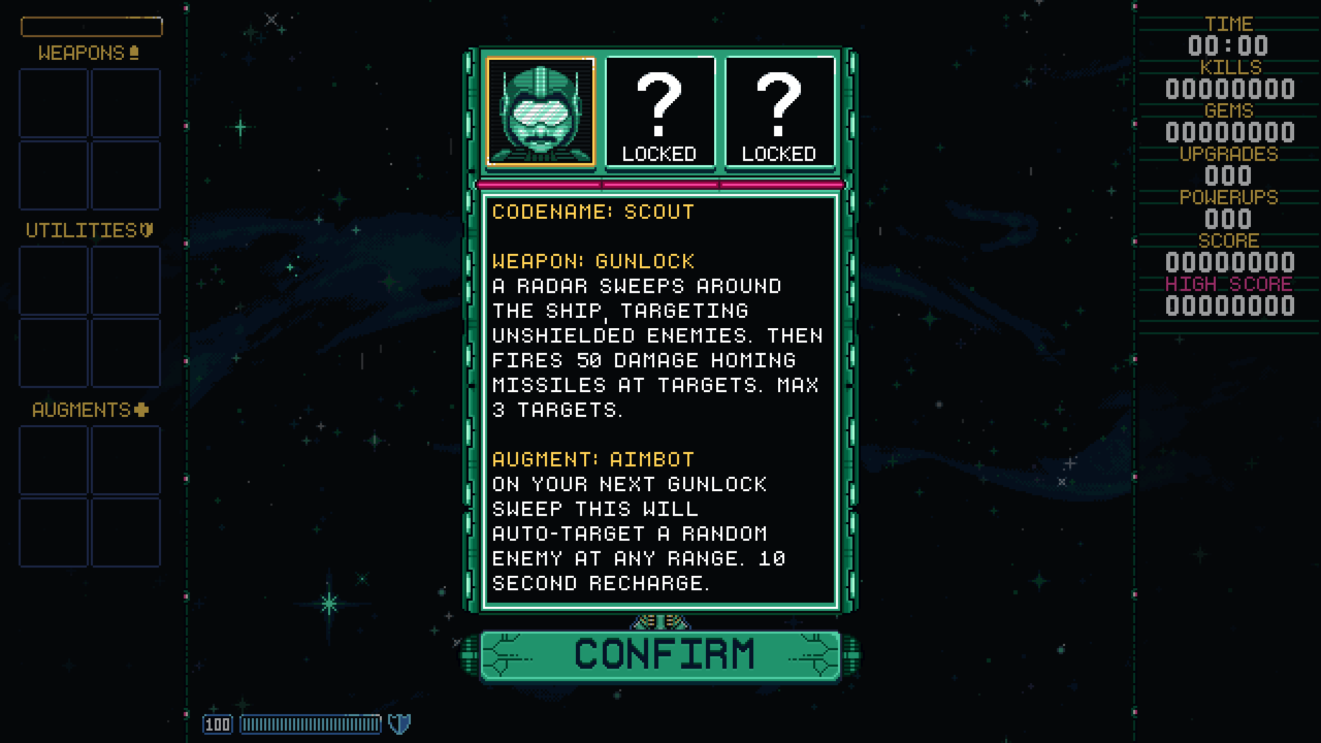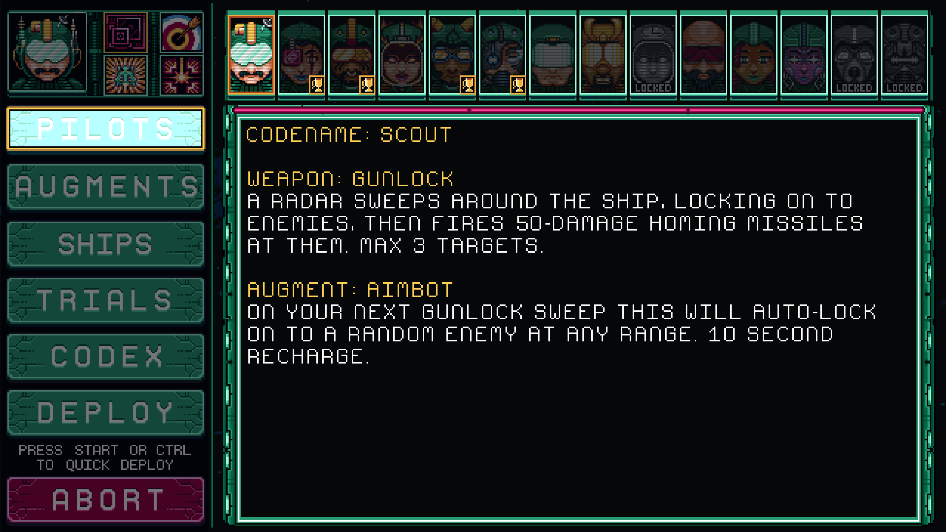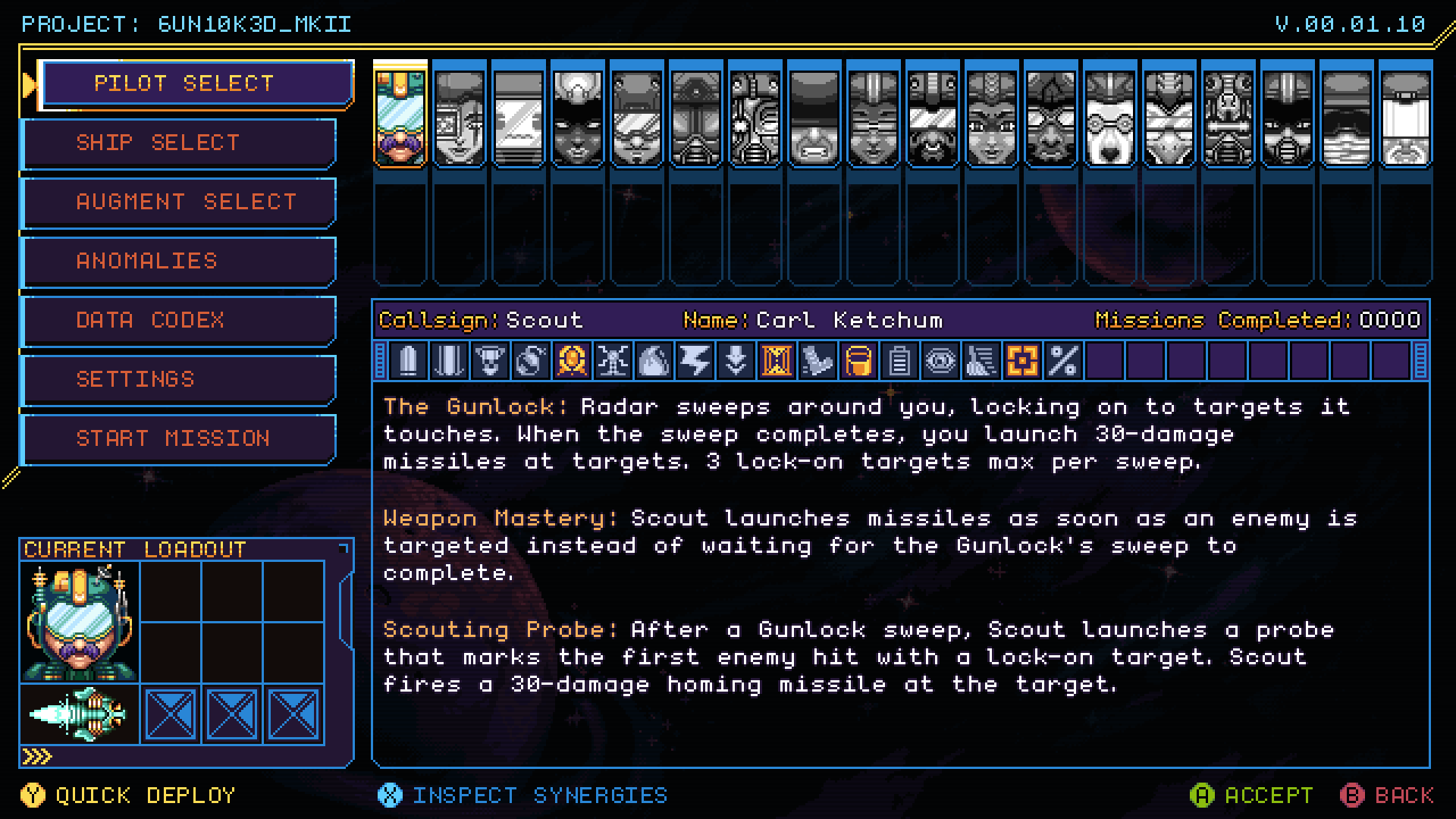 Eventually, as the game's popularity began to swell (around the 0.25 release) I was encouraged by a player to add more flavor to the pilots, and in doing so, it set off a chain reaction of adding more detail and color to the entirety of the game. Everything from upgrade icons, to menus, and bosses. Even asteroids and gems changed multiple times as I pushed to improve the game over several updates. An ethos that has carried through to Gunlocked 2 today. Pictured: The pilot menu you all know, as it is now. Pictured: The pilot menu in Gunlocked 2.