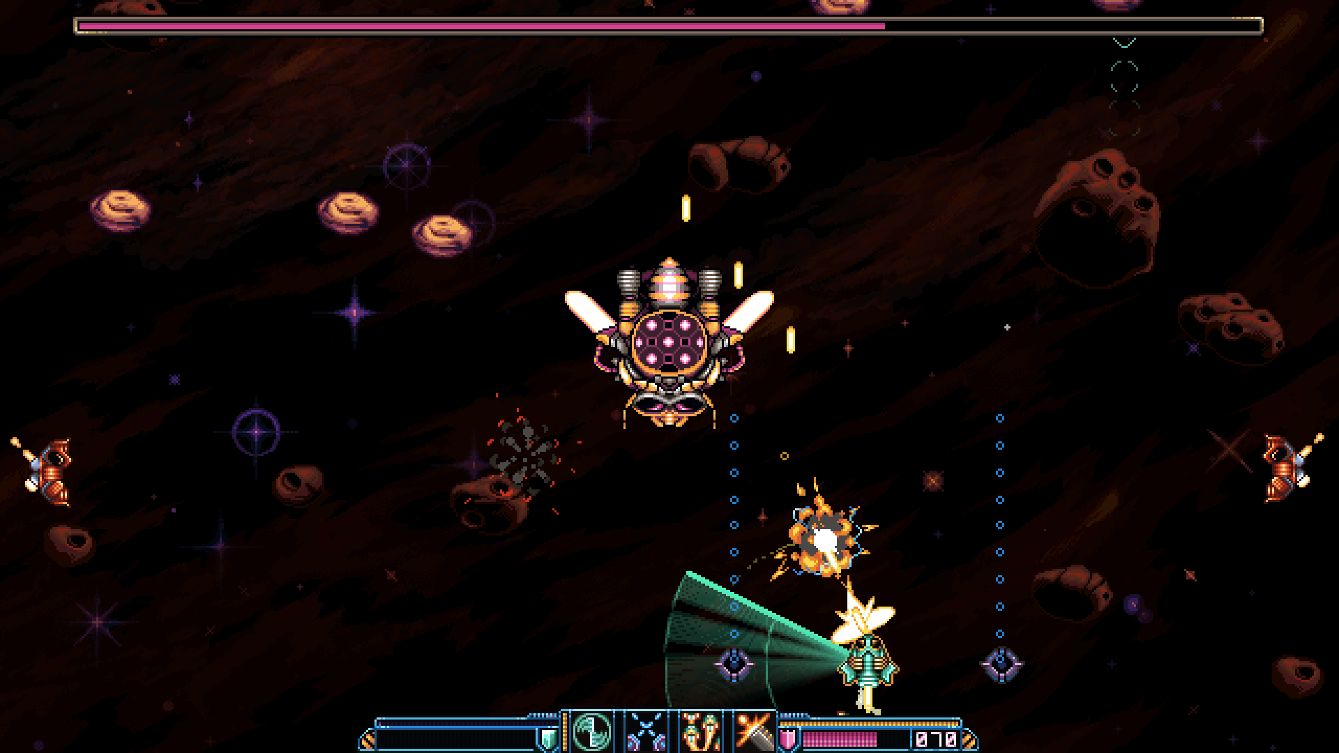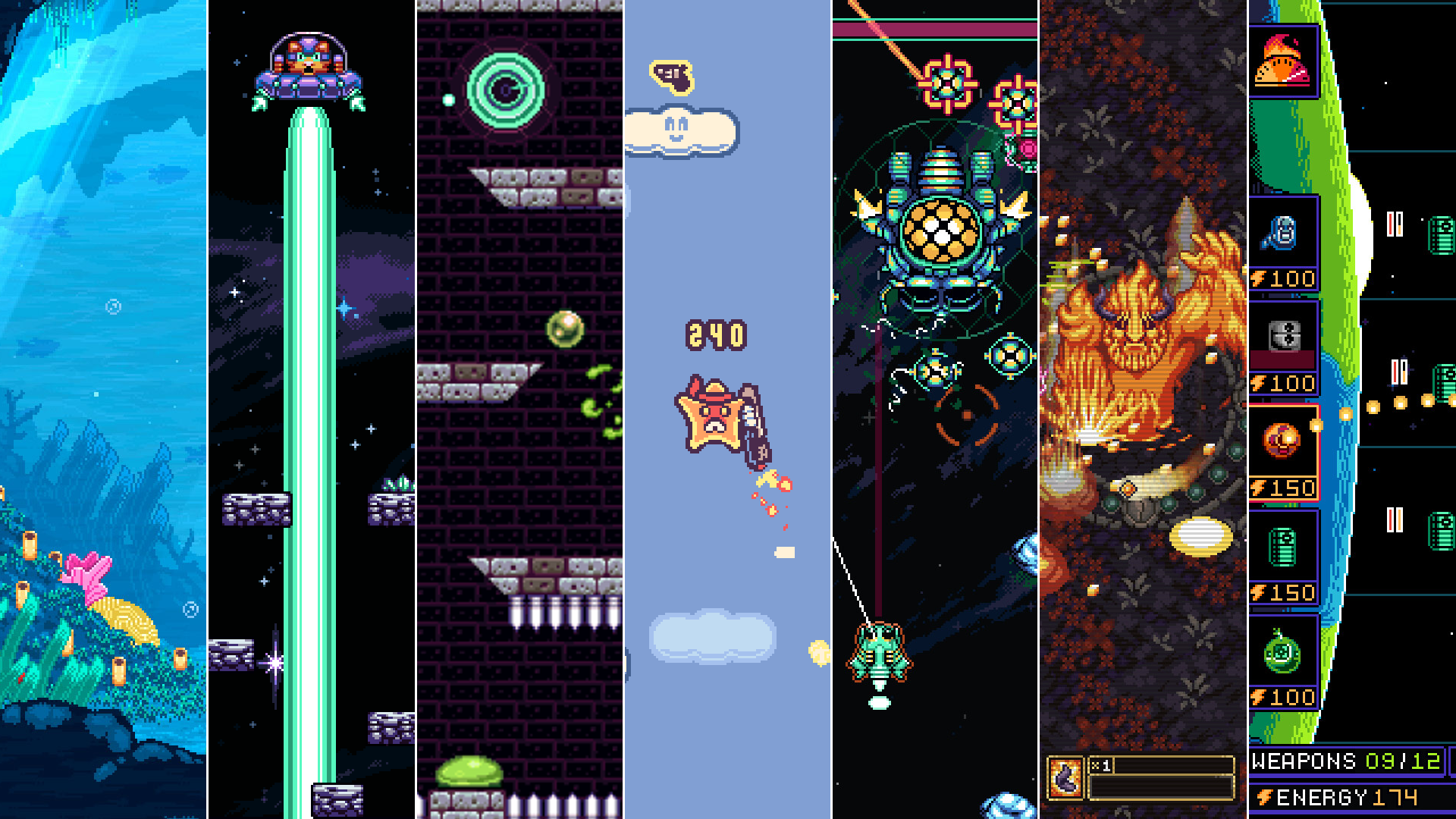 Glorious Pixel Art: Huge, full color sprites with detailed animations make every bullet, bomb, and laser explode with style.