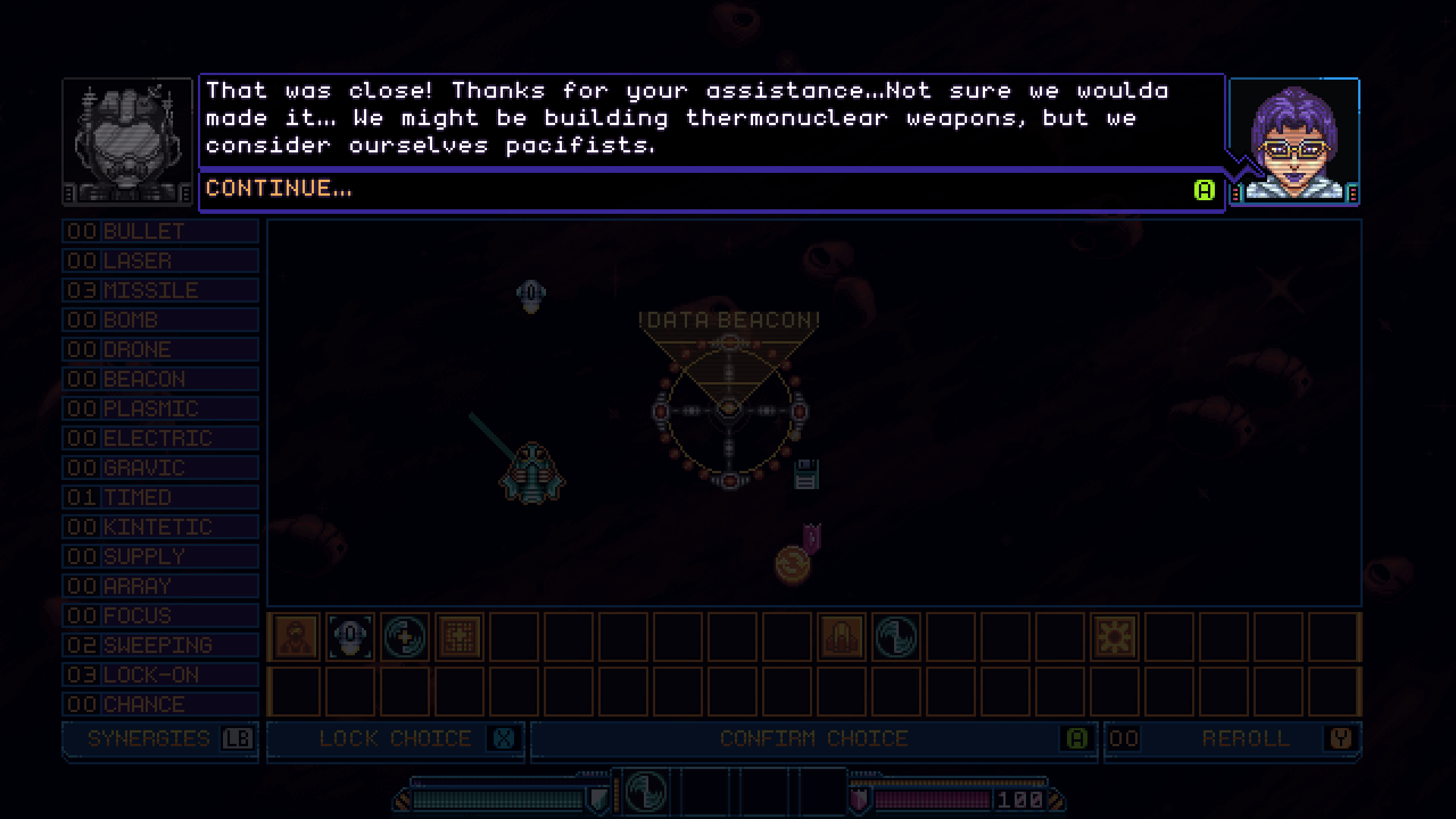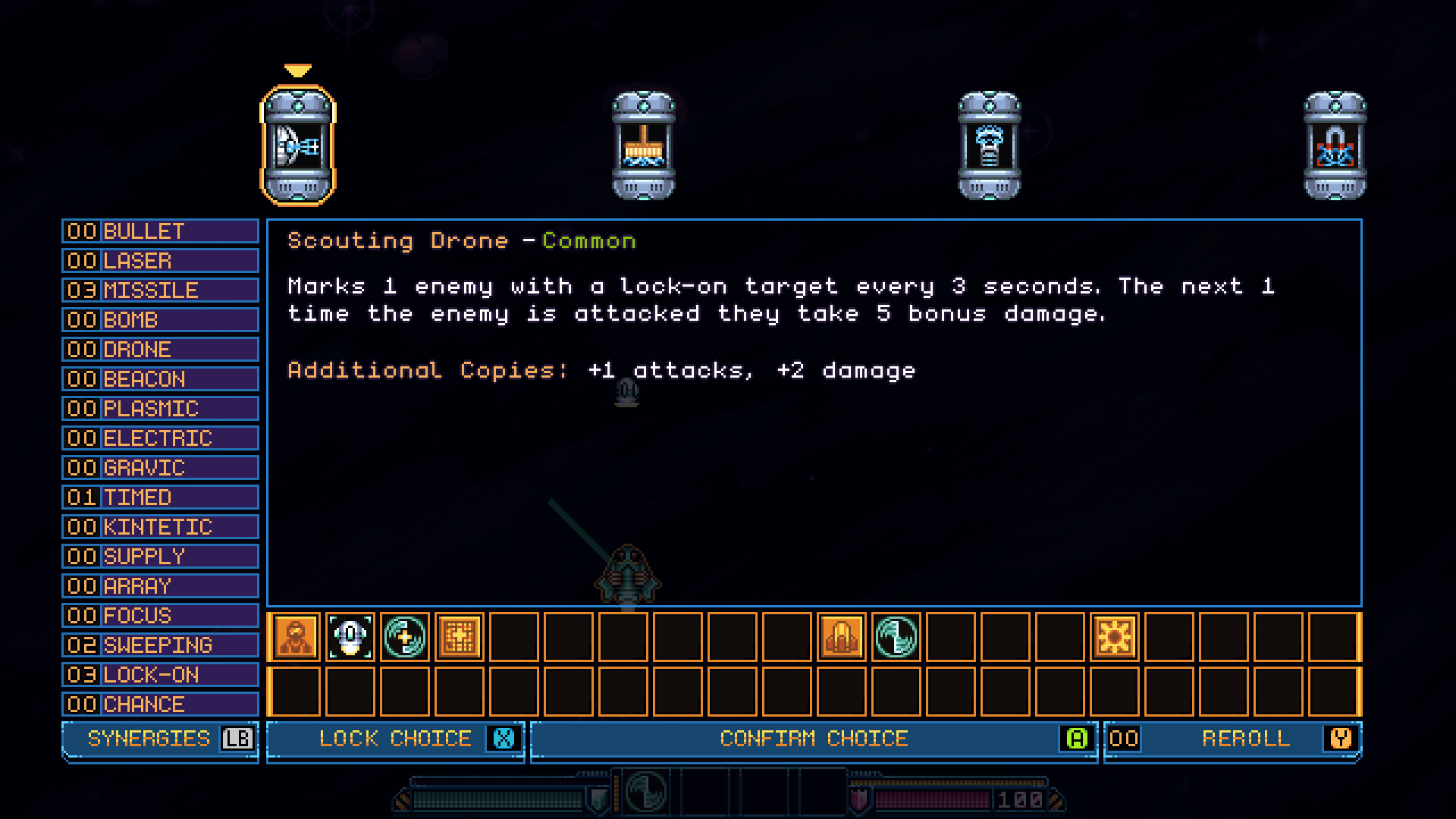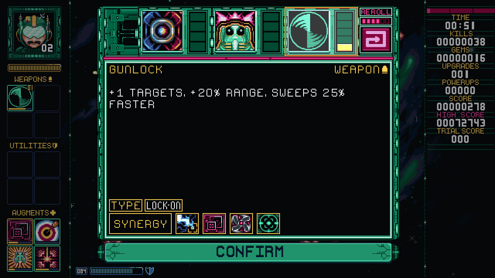 Pictured: Version 1 of the upgrade menu. Featuring the old icons before the redesign. No rerolls. No synergies. Pictured: The upgrade menu as it is now. It was the previous lack of synergies or a plan for them that prevented me from doing more with this system. Pictured: The upgrade menu in Gunlocked 2. Designed with extra space for many more possible choices. You can also read about synergies, and instantly see and count how many of any synergy type you already have. A common request in the original that just wasn't possible.