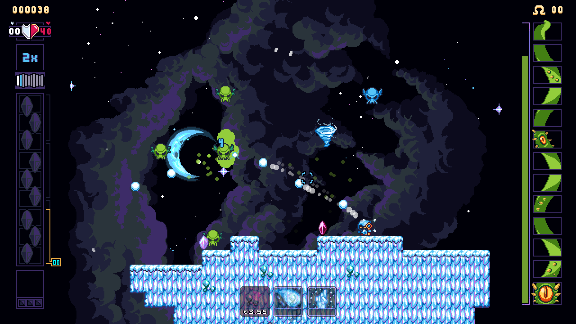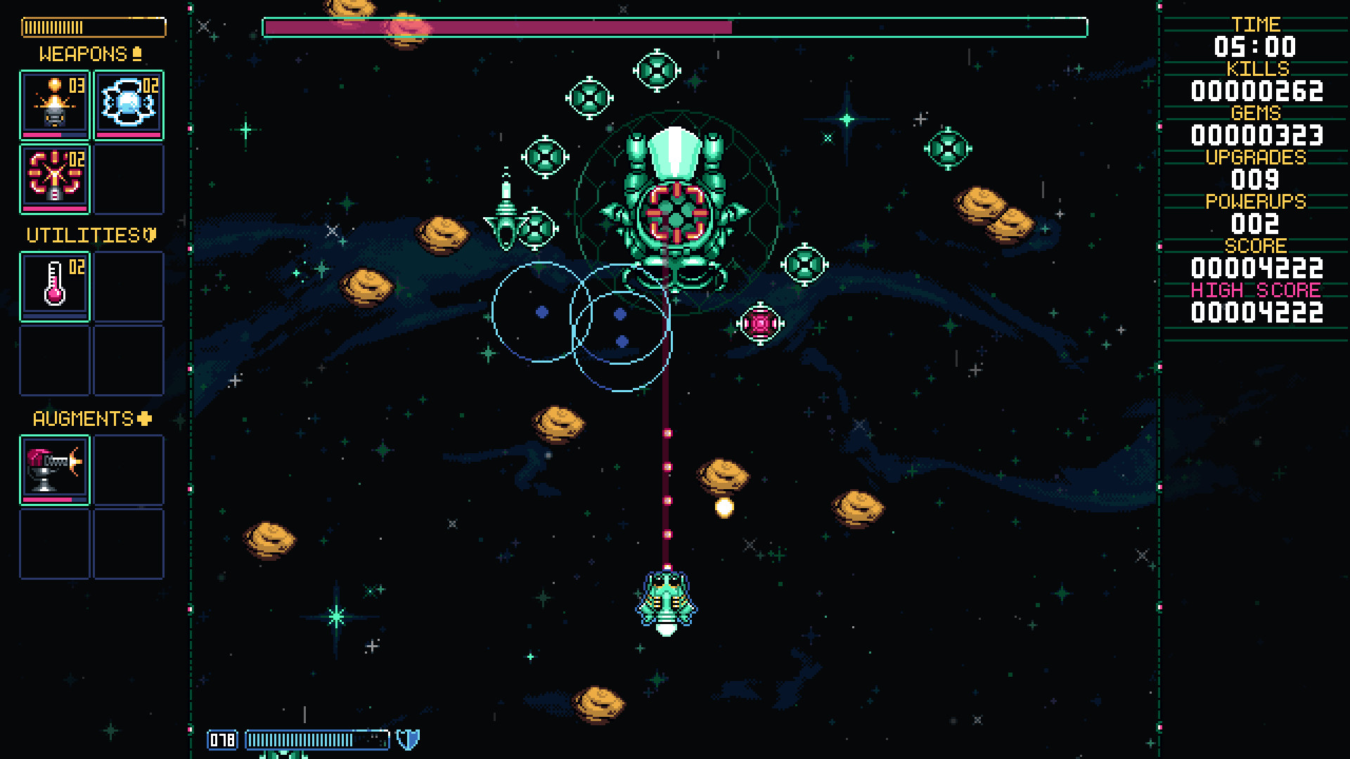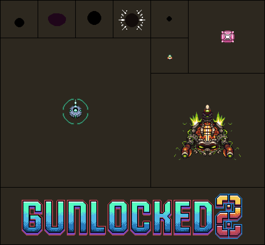 Pictured: Version 1 of the Hive Queen boss. Taken straight from the mobile game, and before I added more color to the palette. Pictured: The Hive Queen now, alongside the improved UI and upgrade icons. Pictured: The Hive Queen in Gunlocked 2. A far more aggressive and versatile boss that makes use of the increased battlefield size.