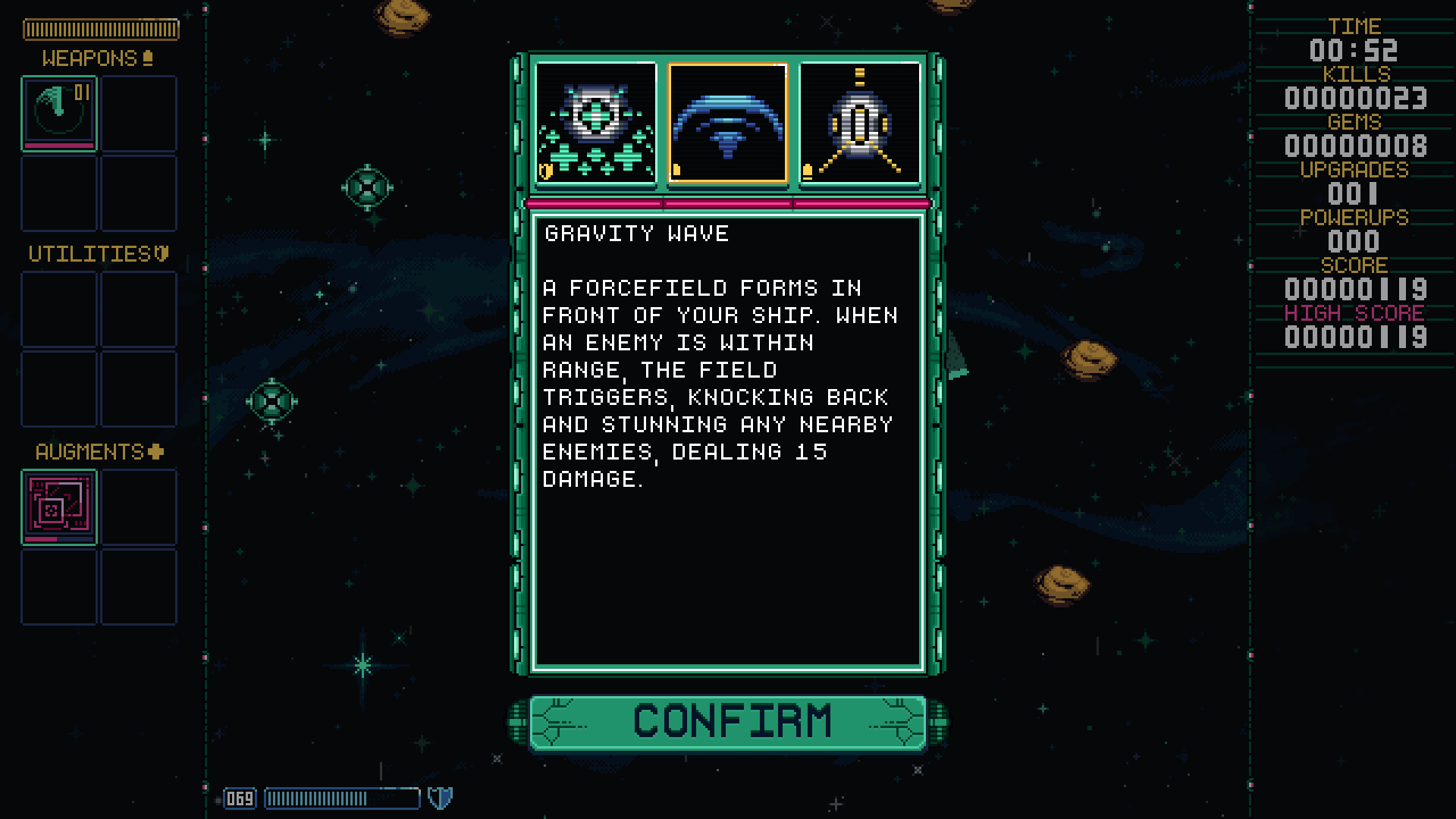 When the game first launched, there wasn't even a main menu for selecting pilots, augments, ships and levels. That's because there was only 1 level, only 1 ship, only 1 boss, and only 3 pilots. Pilots each had their own unique augment, but that system was otherwise not even in the game yet. Instead, you jumped right into the only level, and chose your pilot right then and there. Pictured: The pilot menu as it was when Early Access started.