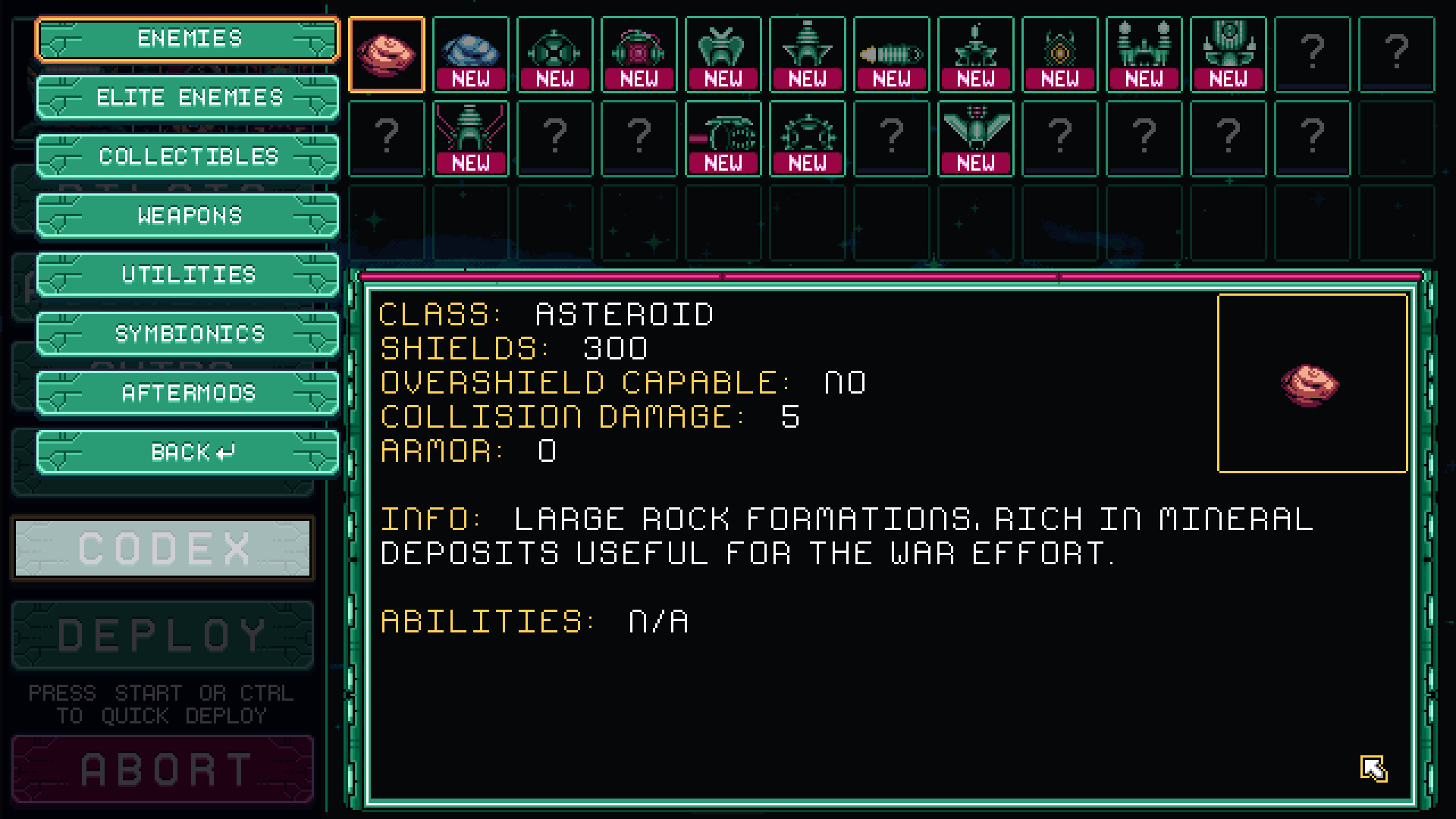 The Codex: A record of every enemy defeated, collectible collected, and upgrade equipped. View a library of knowledge from the Mission Menu before jumping into just one more game.
