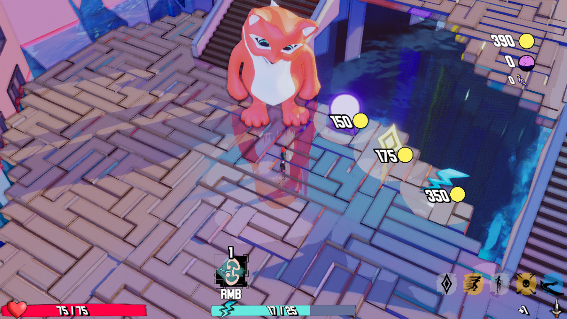 SHOP As you can see there is a Shop as a room between Rogulite arenas, here you can exchange your Happiness to make you stronger but all powerups are for the current run. So choose wisely how to spend your goodies^^