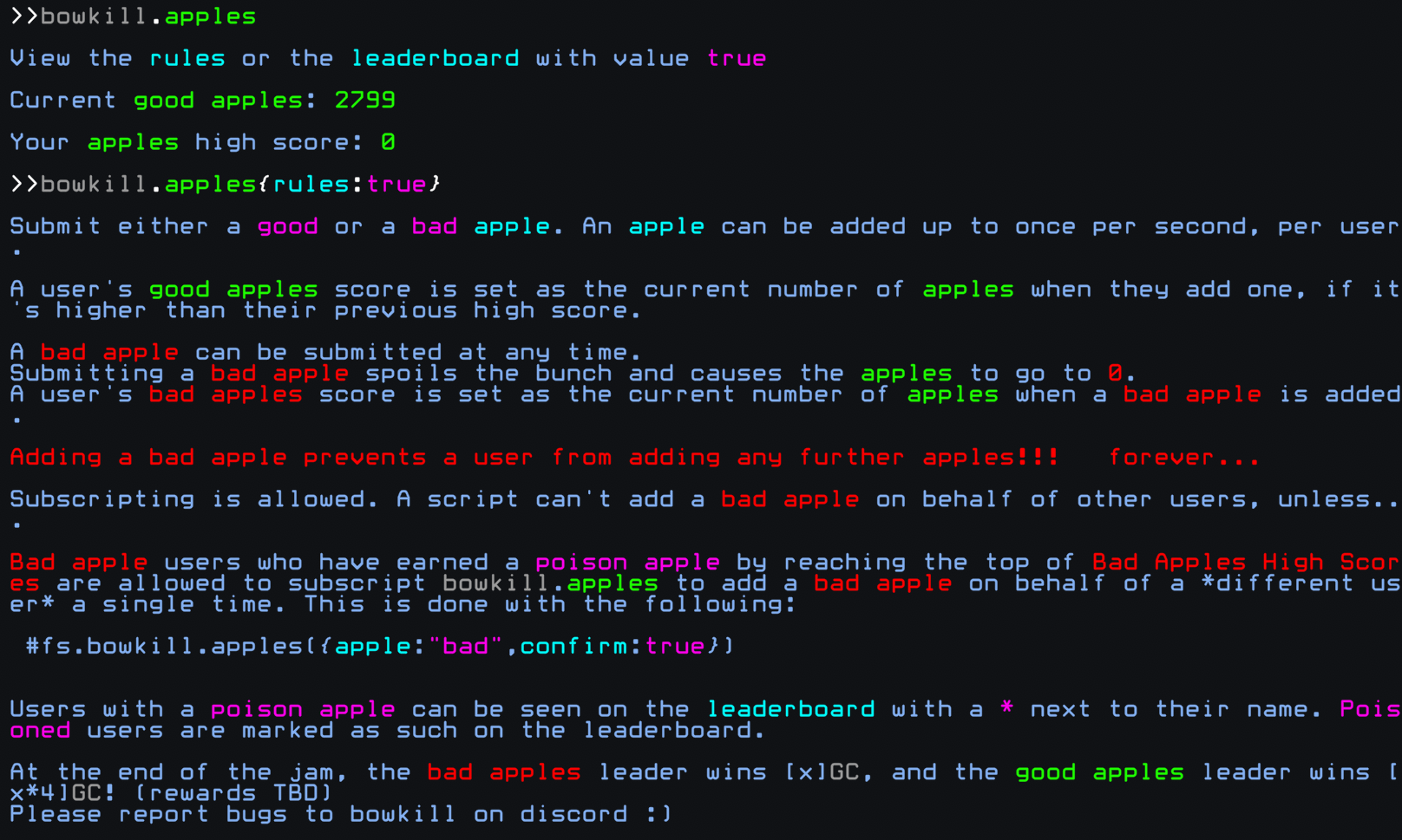 This is NOT YOUR TRADITIONAL GAME JAM. This is hackmud; so we are doing things our way! Instead of separate submission and voting periods, there will be a 7-day window to submit, play, vote, edit, and ship the best version of your script that matches the game jam theme. Players can vote throughout the event.