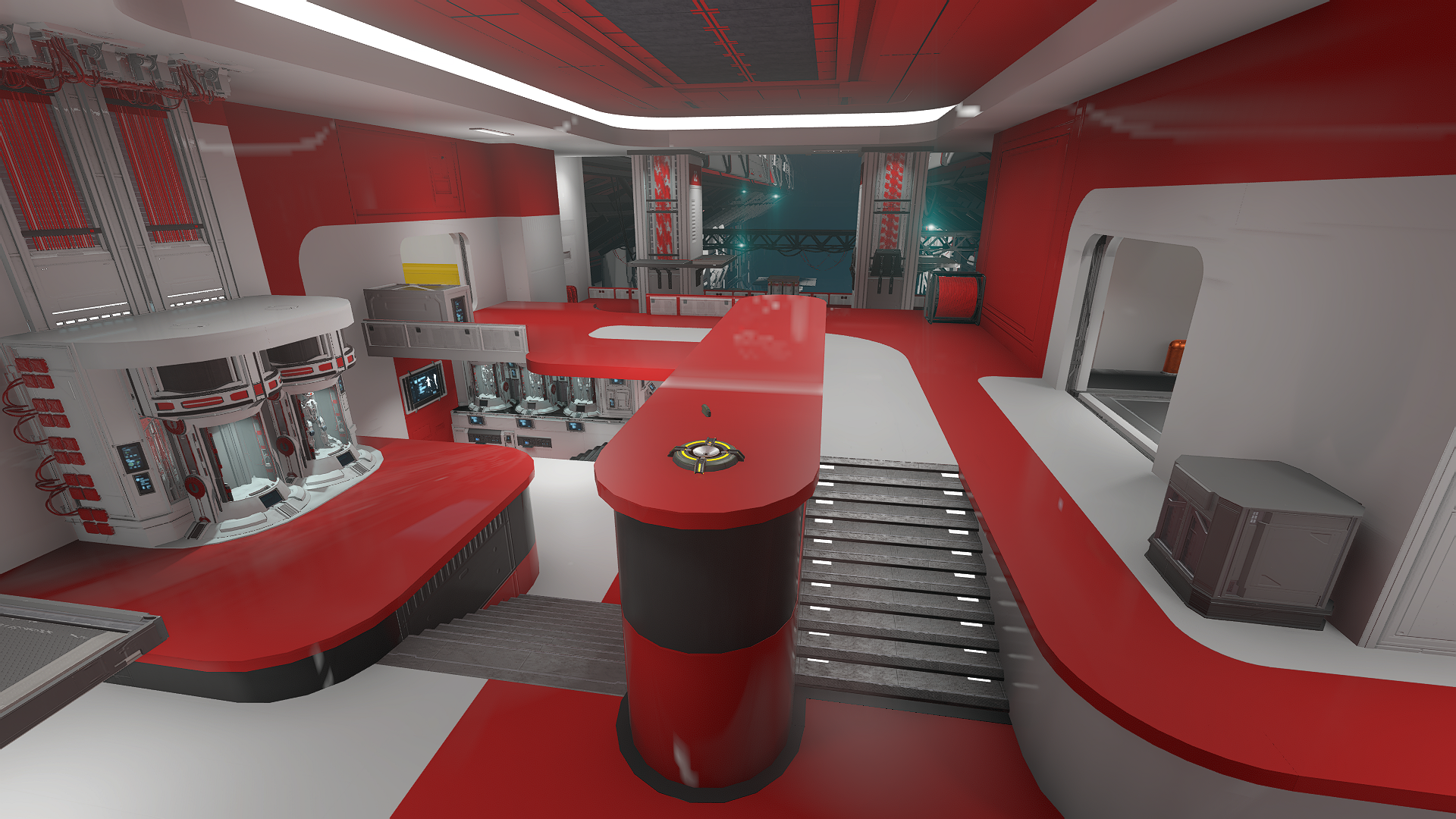 Commander Agryna led Dinh through the entrance and into a control room filled with stacks of consoles and monitors displaying an array of readouts. Nearby, a thin horizontal viewscreen looked out at the deep space relay dishes. Agryna strode over to a console and began entering commands, prompting the central monitor to show what lay within the rectangular structure next to the base.