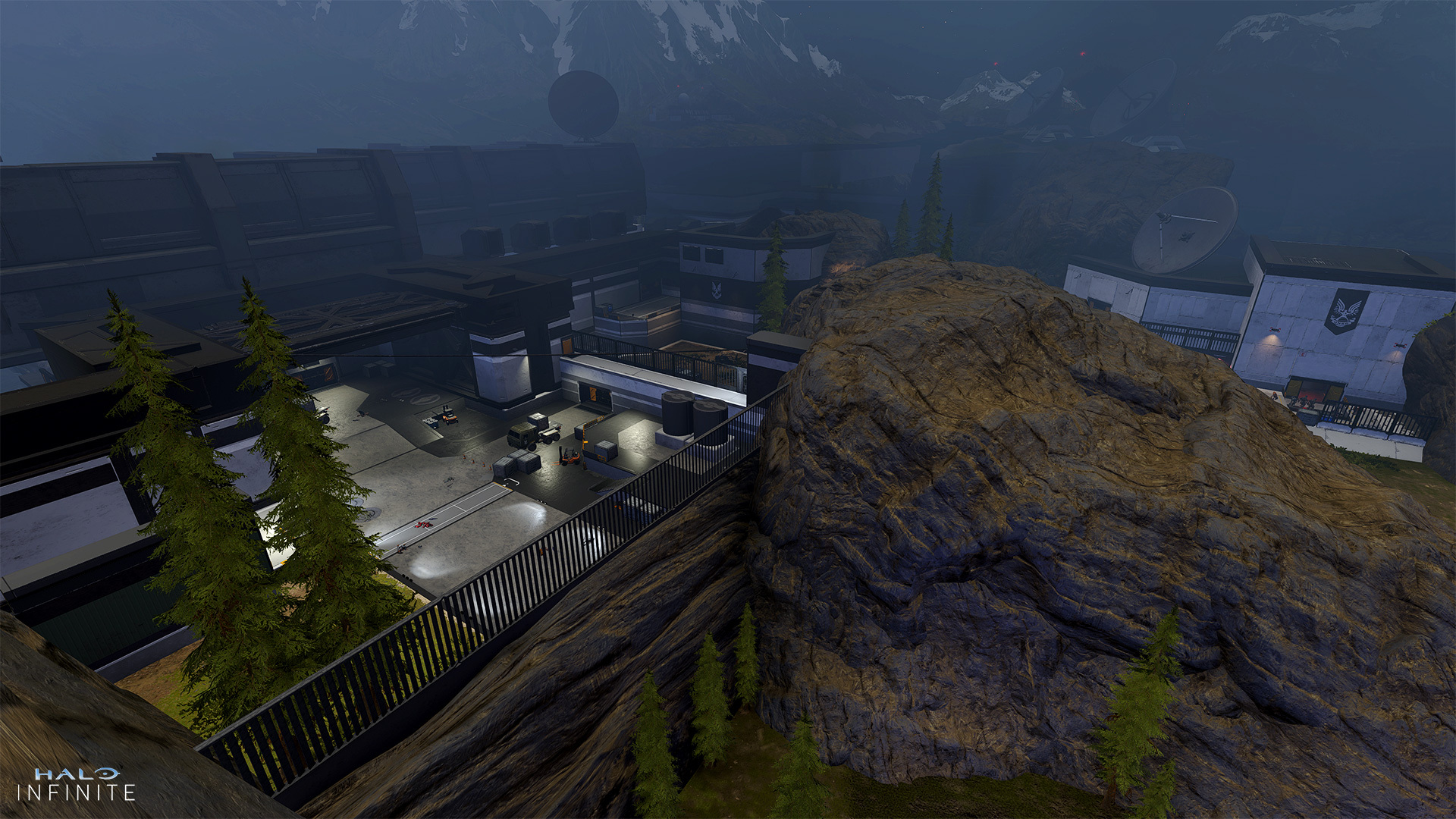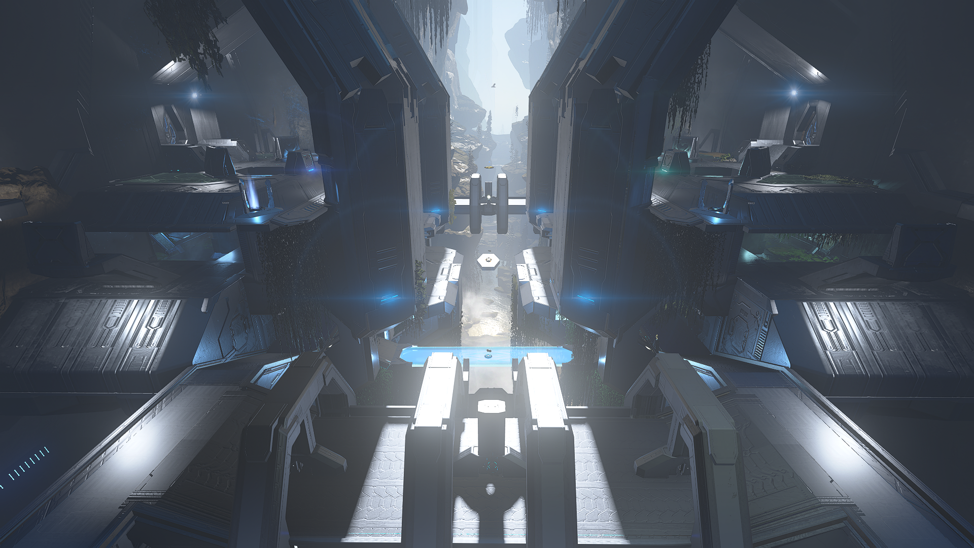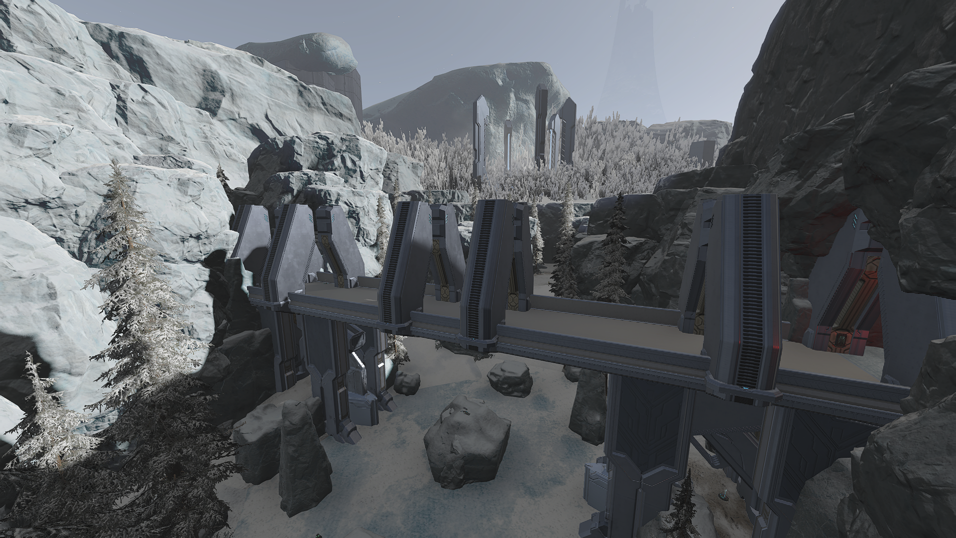 A tribute to Lockout (Halo 2) and Guardian (Halo 3), Guardlock is a hybrid map that presents an etude in asymmetrical catwalks and rooms of death. Borrowing inspiration and elements from its twin namesakes, this map is also available in both “frigid mountain” and “sweltering treetop” aesthetics. Call it “variations on a Forge.”