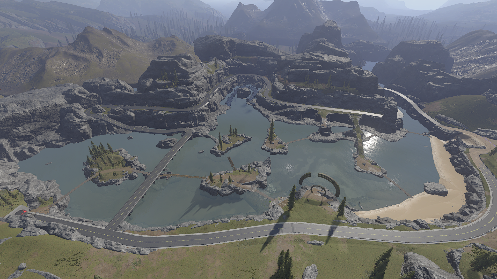 A lakeside circuit built for cops-and-robbers Infection modes. A team of Infected must use Razorbacks to pursue runaway Survivors on Mongooses. Use your all-terrain superiority to lay down the law before time runs out, or else the bandits get away. Nothing but open road between you and cold justice.