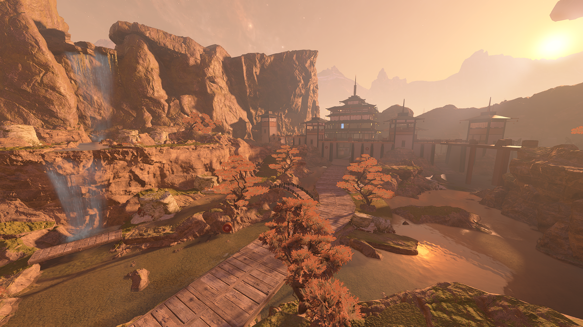 A sprawling estate for an esteemed ninja family. The serene surroundings of the valley boast lush gardens, cherry blossoms, and roaring waterfalls. Should enemies stroll past the scenery and penetrate the outer wall, try taking gravity lifts into the watchtowers to defend the courtyard.