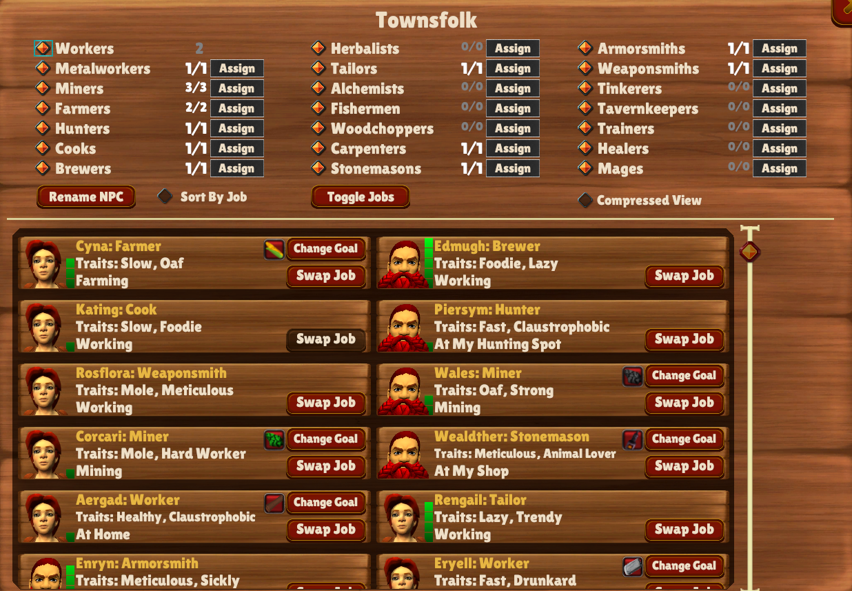 Unassigning NPCs After getting a lot of feedback on this over the past few months I've decided to work on a system that will allow you to unassign an NPC from a job without having to swap them with someone else. This new system will also include an enhancement to the overall townspeople jobs system.