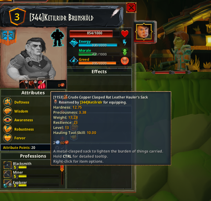 Improved tooltips in character screen, to give the player some much needed information when deciding which attribute to level up. (Note: The new UI for profession values only shows up when holding CTRL, to keep clutter down).