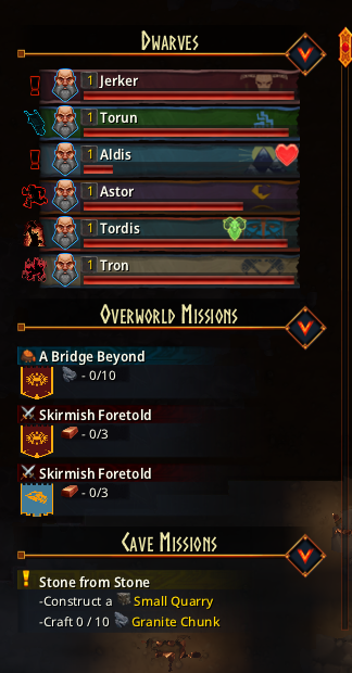 Combined 'Dwarves Portraits', Overworld missions and Cave missions to one singular list.