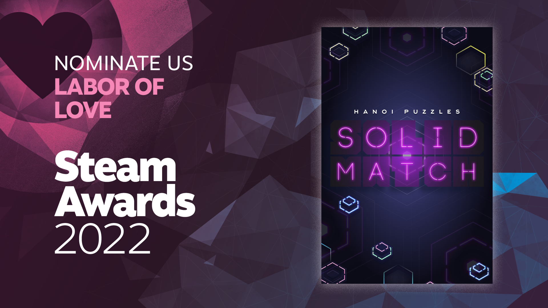 Let other people and Steam know about your experience by nominating Hanoi Puzzles: Solid Match for the Steam Awards! It is perfect for the 'LABOR OF LOVE' category.