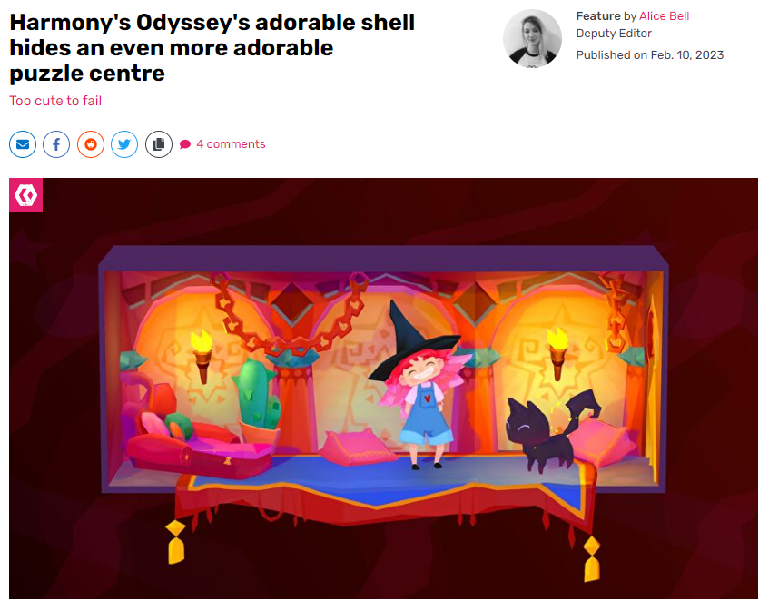 Last week we had the pleasure of being a part of Magic Week on Rock Paper Shotgun, with Alice Bell showcasing some of the most exciting things about our cozy adventure puzzler - Harmony's Odyssey. Just to point out some clippings: