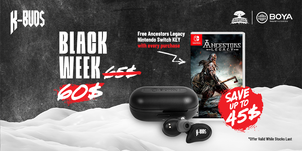 Now you can buy official Destructive Creations K-buds cheaper with free Ancestors Legacy for Nintendo Switch digital key to every purchase. Offer is valid till 29.11.2020 or while stocks last.