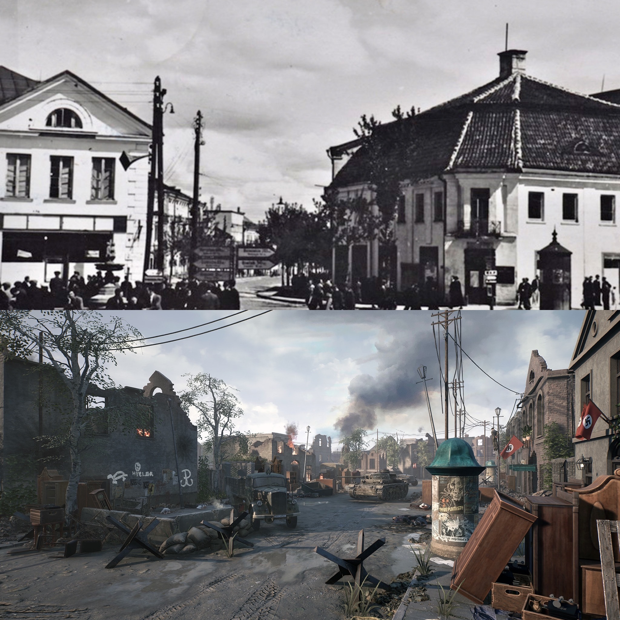 Even though you oversee the war from above in War Mongrels, we make every effort to present the world with maximum detail and historical accuracy. Below is a comparison of a historical photo of Białystok and the same city destroyed by war in War Mongrels.