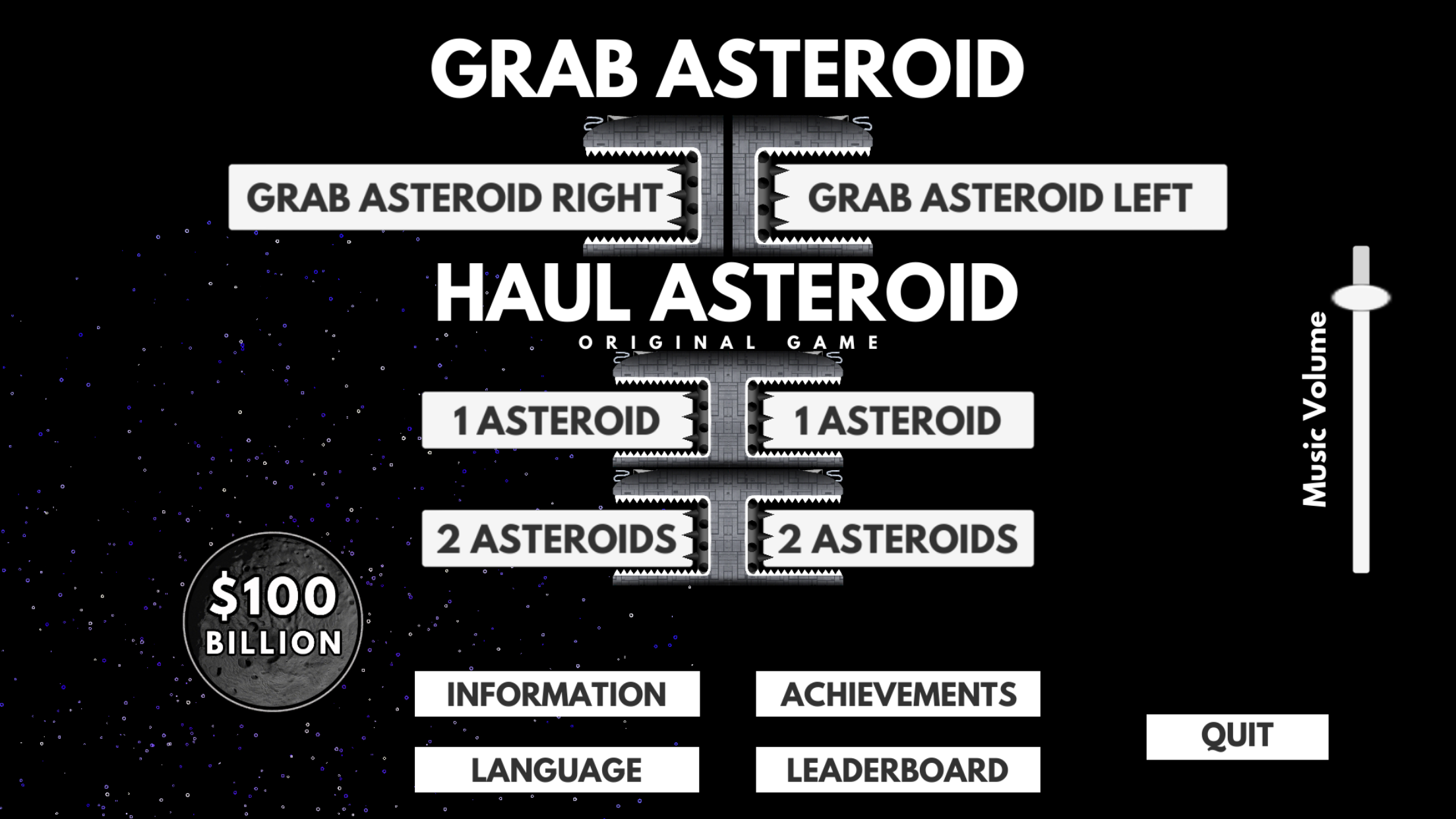 GRAB ASTEROID level: Asteroids are flying every which-a-where. Same double-pendulum game play but now multiple asteroids on random paths. Sometimes they help, sometimes they get in your way, sometimes they even go in on their own - as a matter of fact, if you just left the game running continuously, you’d have a Steam achievements mining rig!
