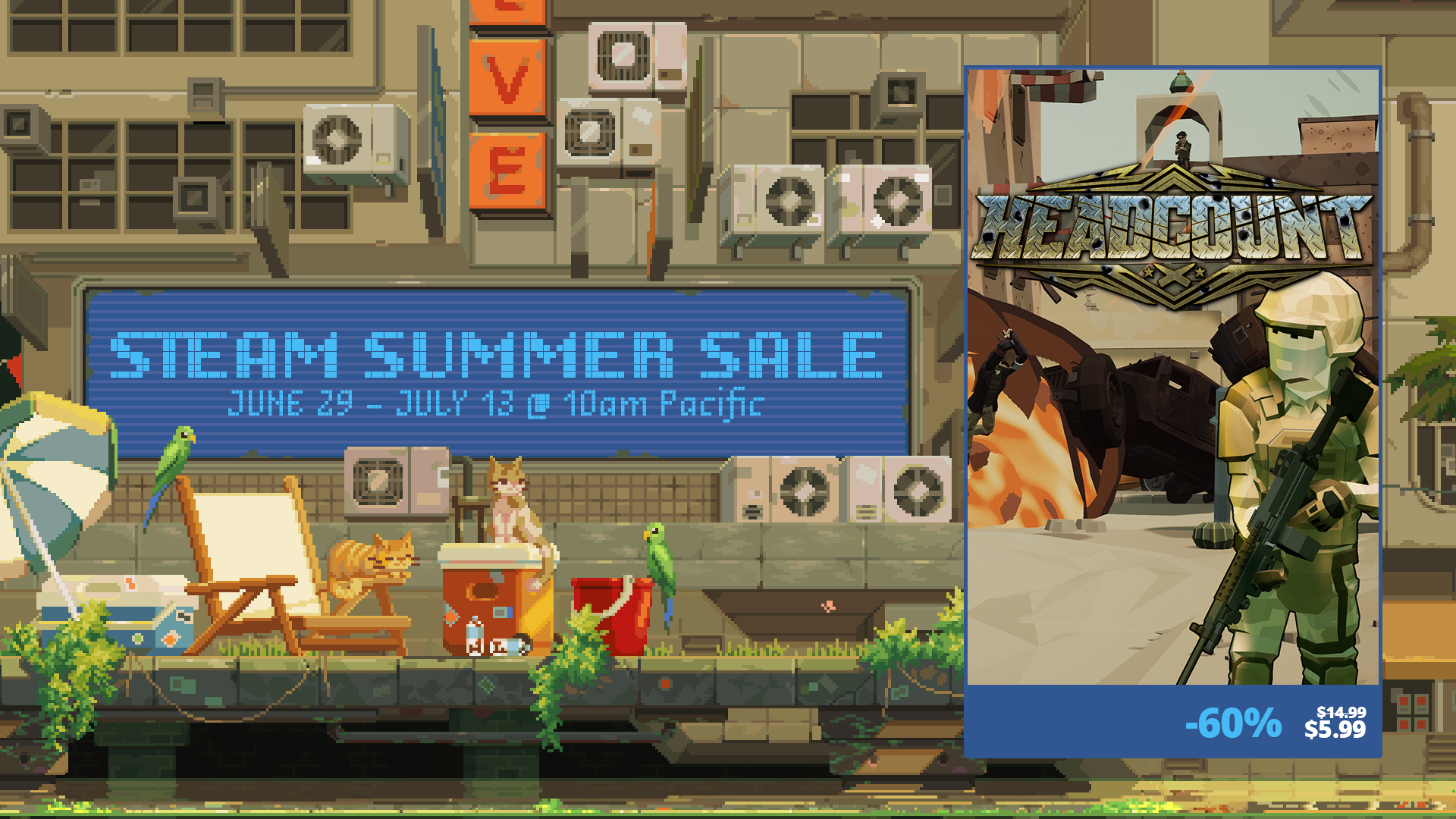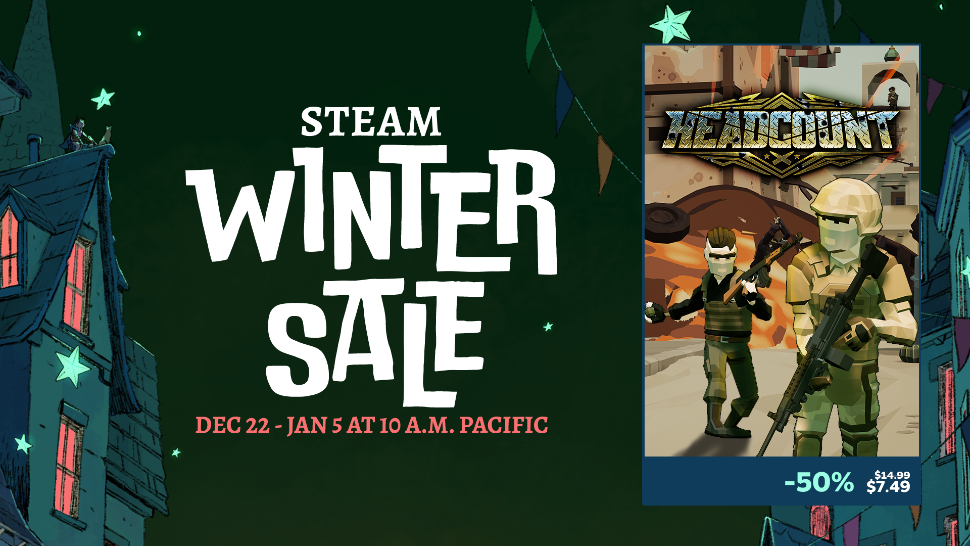 - Headcount v2.0 overhaul patch - Brings Steam, Applabs and upcoming PlayStation release version into feature parity - Overhauled aesthetics. updates to just about every material + shader in the game - Countless bugs hunted down and fixed - Default weapons are now different for each level, to keep the action fresh for new players