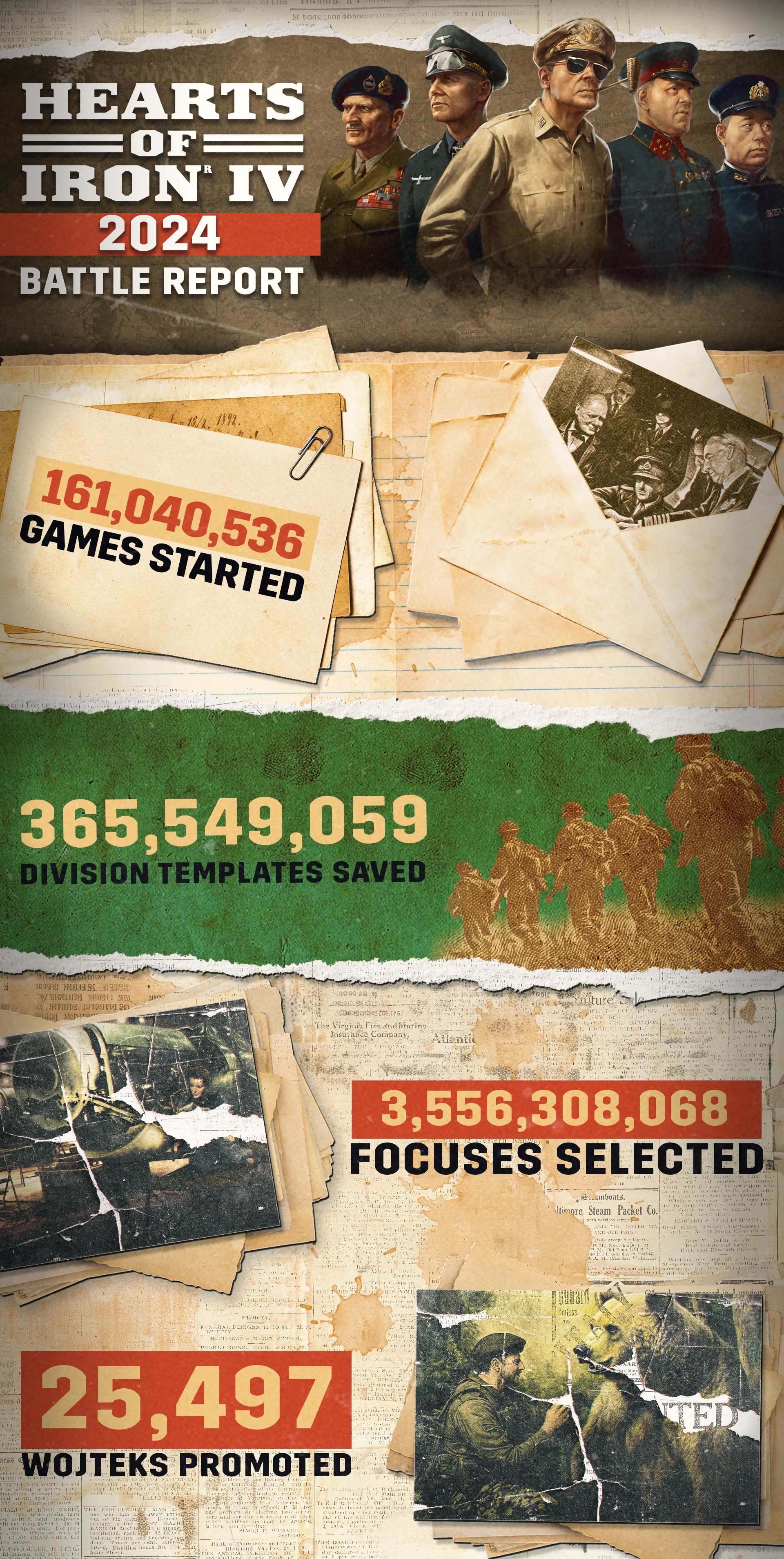 The year is rapidly coming to an end but the battles rage on. Below, you’ll find a brief snapshot of how your collective efforts shaped the Frontlines this year, whether you focused on making the best Division templates, completed the focuses you needed for victory or Promoted the best friend one can have. For the full roundup, march over to the forums and let us know what stats you wanna see next time!