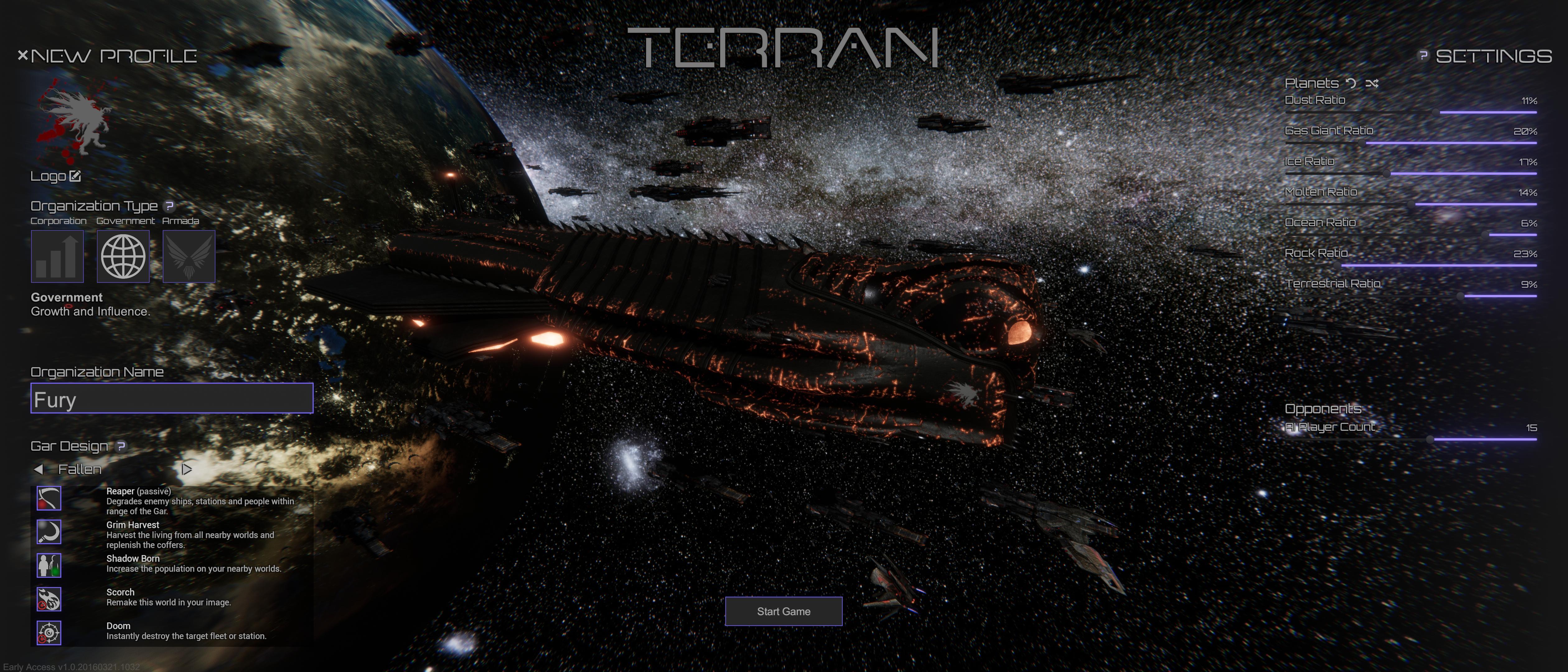 Gar have been re-introduced to the game in a new incarnation. Gar are massive ornate ships that represent your organization as a whole, serving like a capital. Each Gar has a set of unique abilities which may be passive effects, active abilities or special start conditions. Passive effects and active abilities have associated technologies and can be upgraded in the new Technologies system.