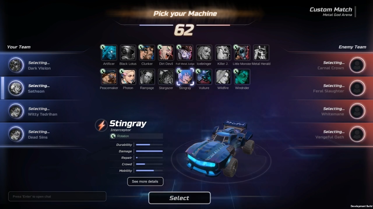 The Machine selection screen has been updated to a new layout, which applies to all game modes. It will automatically adapt when the Ranked Draft mode is enabled (for competitive modes or Custom Matches). Additional changes have been included along with the new visual: