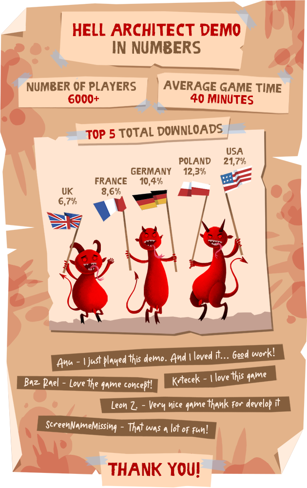Today we will not spam you with progress in the game – today we want to show you the Hell Architect demo in… numbers! Yes, yes – the numbers are so impressive that we are now PROUD (even Lucifer is impressed 😉).