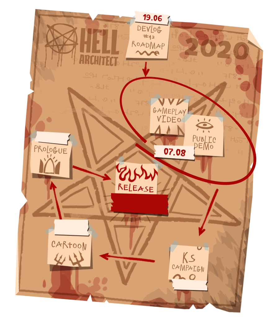 As you can see first we'll show you gameplay video (really soon). After that we want to start KickStarter campaign (wait till you see rewards for backers ;)). Also we'll show you animated cartoon with Devils and Sinners from Hell Architect. Between that we'll release Demo and Prologue (free ofc).