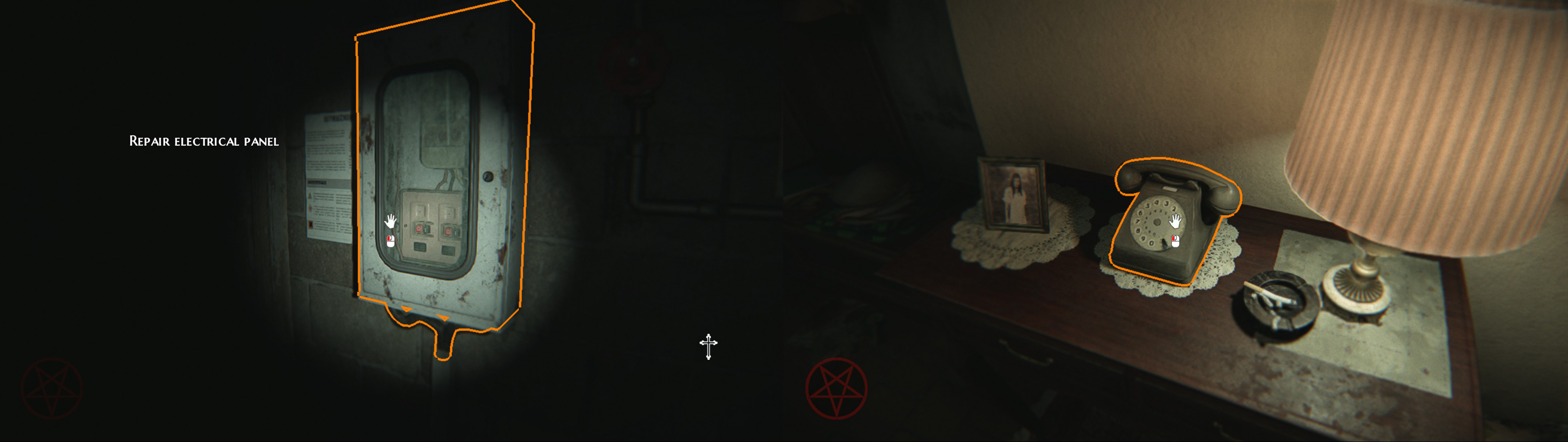 We identified a couple of moments in Chapter 1 where players might find it difficult to understand what to do, especially when playing the game for the first time. To address this issue, we added a couple of graphical elements in these points to indicate the objects players need to interact with to progress in the game.