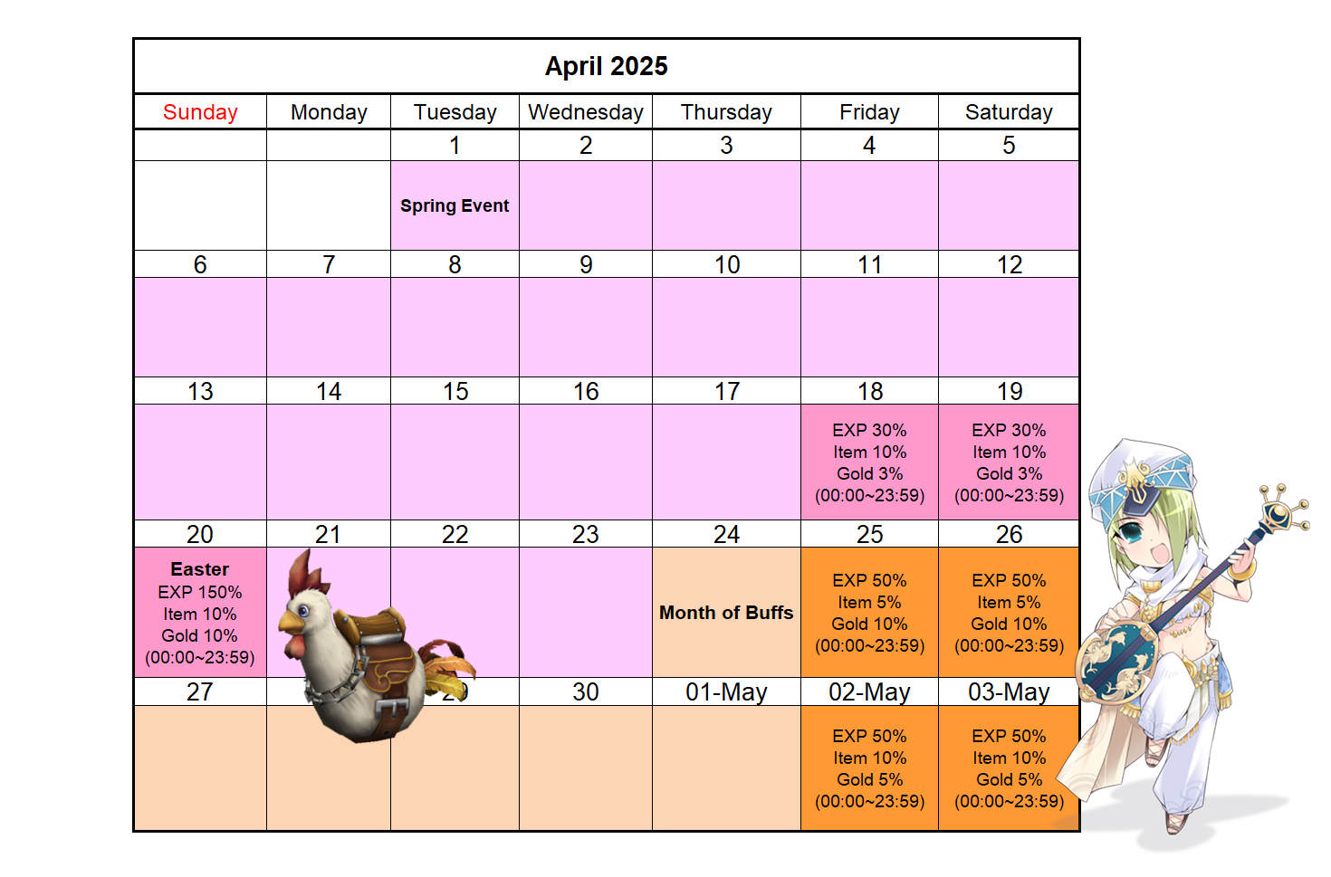 2) April. 20th (Easter) (Free Aid Event, 2/4/6 hours aid) EXP Bonus 150% for 24 hours. Item Bonus 10% for 24 hours. Gold Bonus 10% for 24 hours.