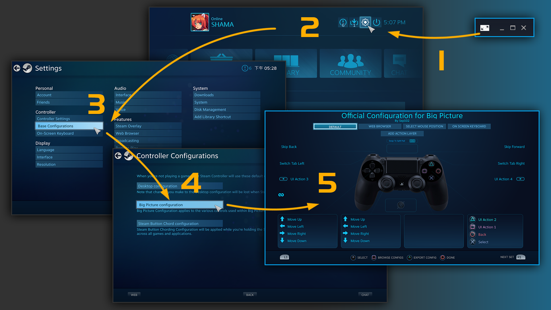 ◆ Notice! Must be in default Big Picture configuration. [Big Picture] Mode/ Setting / Controller Configurations / Big Picture Configuration / Default