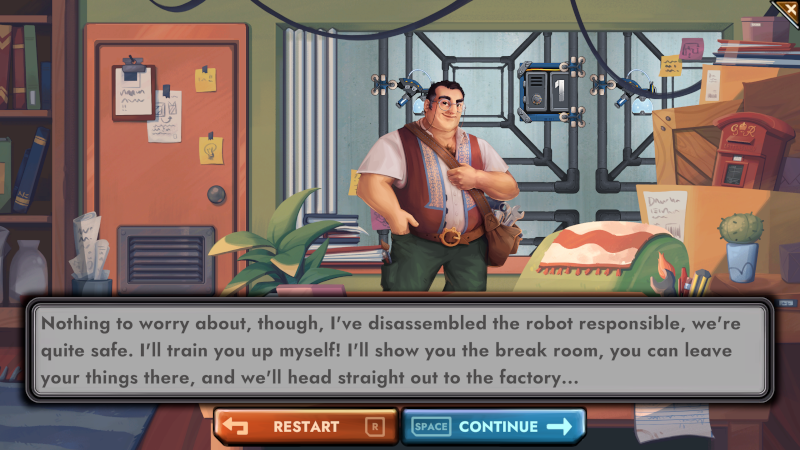 A storyline! As you play through the demo, you'll see that the robots that work in the factory keep misbehaving. So far, Dantar hasn't cracked the reason why. The Kickstarter beta levels don't have narrative yet, since those are likely to be redesigned or moved around.