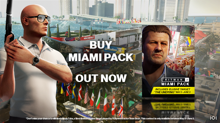 We’re excited to announce the HITMAN 2 Miami Pack, a great opportunity for new players to join the game for a low price and experience what that the World of Assassination has to offer, including the chance to play the high-stakes Elusive Target game mode and eliminate ‘The Undying’, played by Hollywood actor Sean Bean!