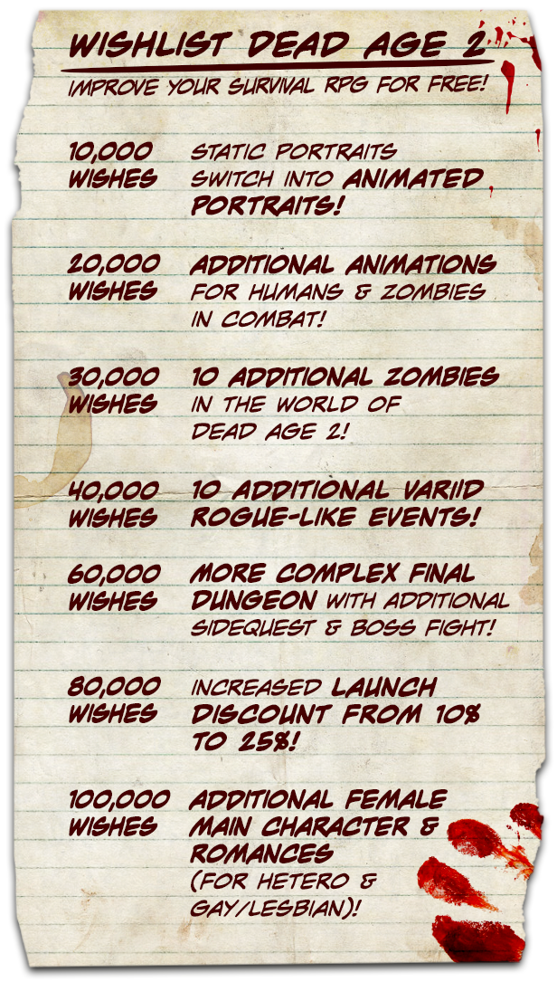 And we've got more great news for you! You can improve Dead Age 2 even further with our Wishlist event. Wishlist the game and unlock more and more cool features and extensions for it by increasing the number of wishes. We keep you posted with updates when new goals have been reached!