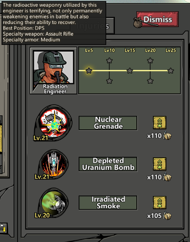 Research Squads can include Bio Soldiers, Surgeons, Daisy Mercs, Pharmacists, Chemists, Engineers, Radiation Engineers, and Signal Officers.