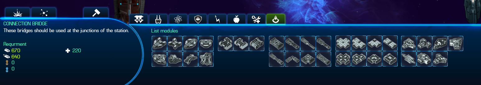Added. The module building menu is divided into categories: factories, turrets, science, army, electricity, food, support and parts of the modules.