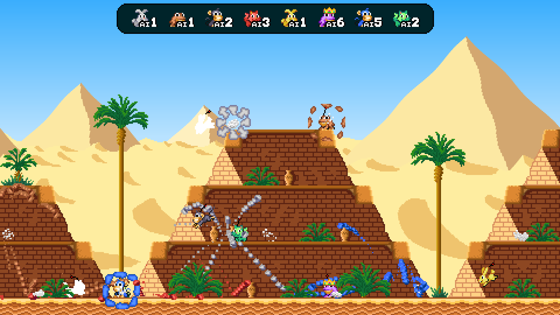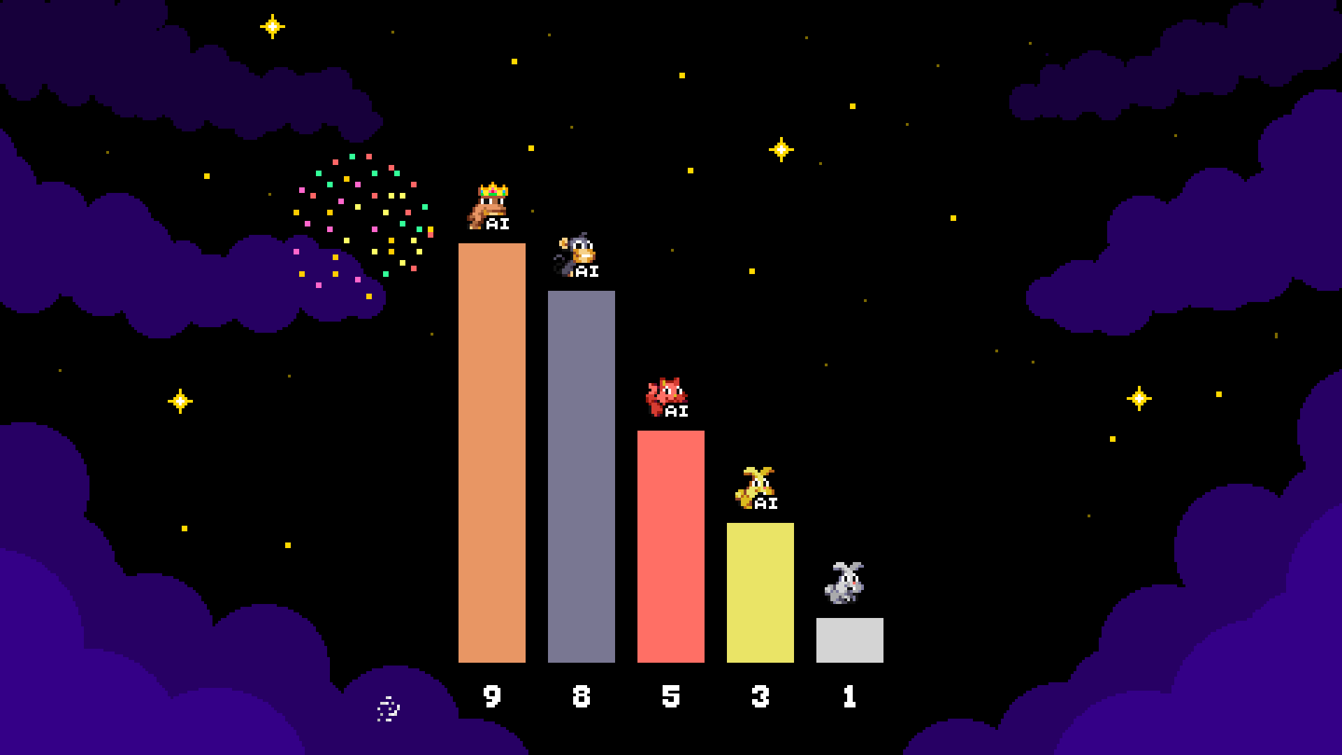 Sudden death! If the rounds finish with a tie, the game enters "sudden death" mode and the tied players have one life each to kill each other. The "last animal standing" is the winner of the entire game. No more ties!