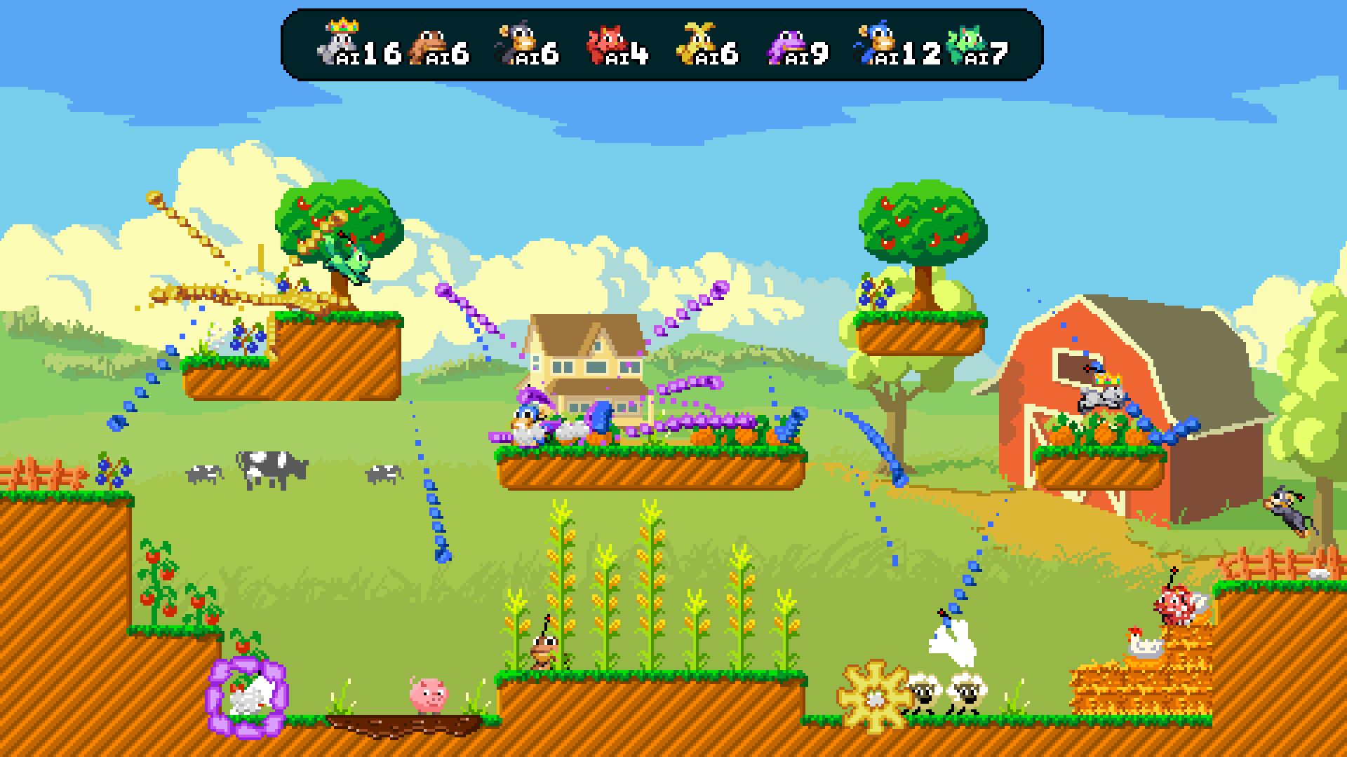 Improved player entry screen - each joining player gets their own "burrow" where they can select their character and colour, before confirming by jumping out. No more stealing colours!