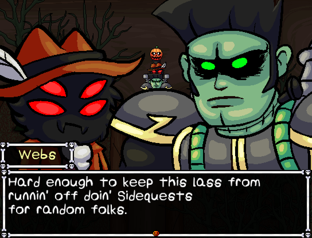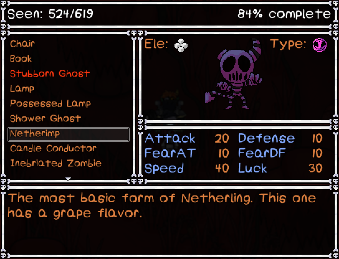 Ever wanted to look back at all the enemies you've fought? Well, now you can! In the brand new Monsterpedia, you can view the stats and Scan descriptions of every enemy in the game. Unlike most "Bestiaries" in RPGs, these entries are location/event based. IE, completing the HorrorVale Town will fill the Monsterpedia with all the enemies you can find there, regardless of whether you actually met them or not. This is so people who've beaten the game can already have theirs retroactively filled. Head on over to a certain monster part loving Goblin in the swamp to buy one for yourself...