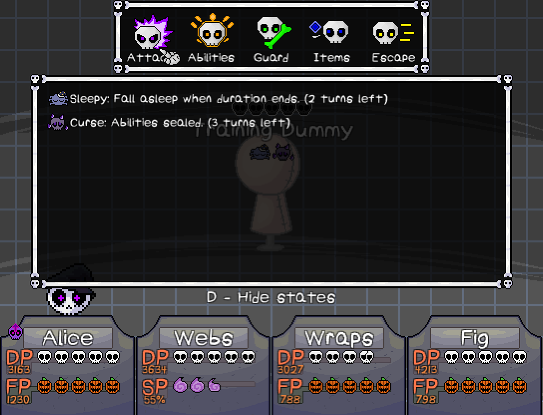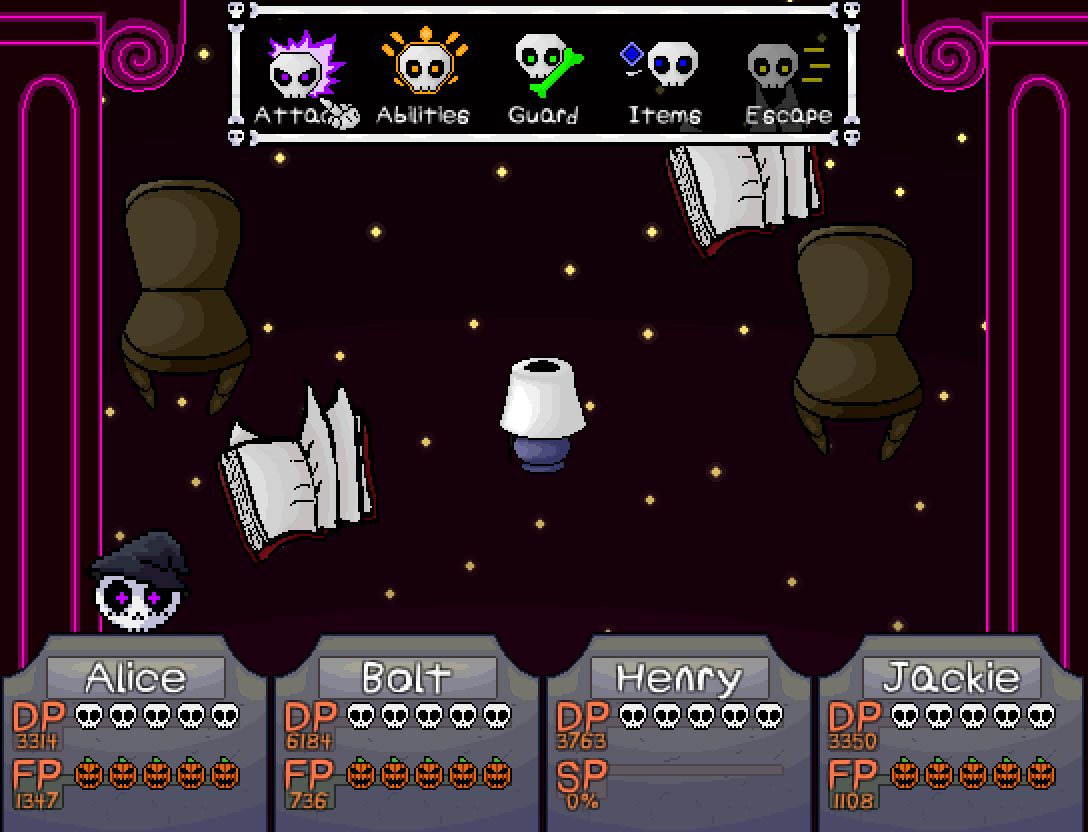 -Movement speed in the HVPD ventilation system has been increased -The Shovel will now do an attack on the first turn like most Chaser enemies -Expanded the range in which The Shovel can notice you and start pursuing you -Added a slightly dark overlay (similar to later locations) to the vents to up the SPOOK factor -Made the location of a Death's Door slightly more obvious -Added a new teleport in "The Underside" that lets you skip the maze after defeating the Miniboss there -After finding the Bunker in "Tale of Two Birds", you'll now be automatically warped back to Scary Town instead of having to make the trip again -Added a new consumable item called "Magic Eyeball" to various Jiang stores everywhere. This will allow you to scan enemies without a Party Member with a scan skill (some of these can also be found in Act 0) -Added an optional way of solving the Frog Note puzzle for people who are hard of hearing (Just tell the nearby Scarecrow you can't hear well) -Added a new hint to the Blood Chalice puzzle -Mask Guy will now give you some direction of where to go next after finding all the Pages in "See No Evil" -Alice will now make note of the Symbols in the Ruined Lab so you pay attention to them earlier -Added a new hint to the final Light Pillar puzzle in The Engine Sector -Added a new hint to Dollop's final request