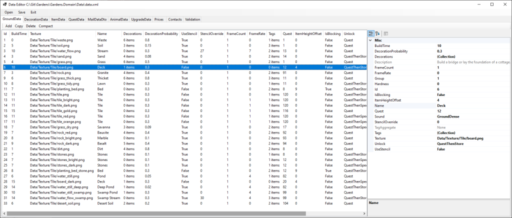 As advertised, Horticular will ship with the editor that I use to make the game. You will easily be able to make changes to metadata that govern the game and its storyline. Currently, that means changing or adding new items, surface types, animals, missions, and letters. With more added as needed during development.