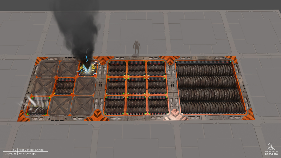 The Rock Crusher is a heavy industrial shredder designed for breaking down metal, especially hostile bots. This final concept gives us a clear visual language for high-power, high-risk processing equipment in the world of Hostile Mars.