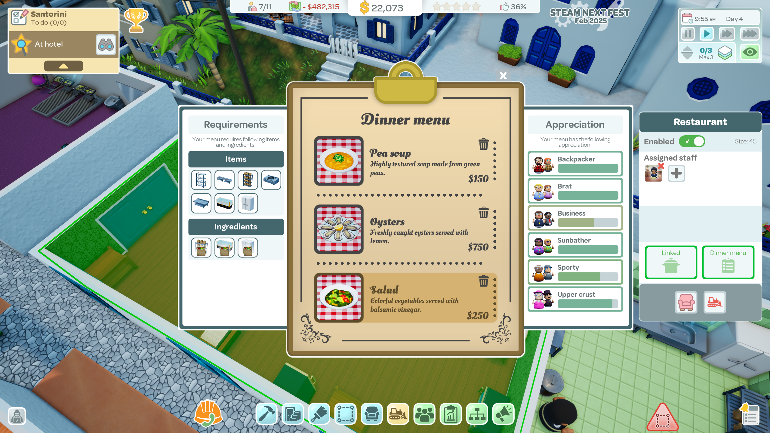 If you played the last playtest, you might notice some awesome new features in this playtest including: - The Paris scenario. - New guest types: Business and Upper Crust. - New zones: Conference room and Spa. - Improved critic behavior and more detailed critic review. - Eyedropper tool. - Photo mode. - Editable task filters on certain staff types. E.g. order a cleaner to only mop floors or a waiter to only collect dishes... - and more 👀