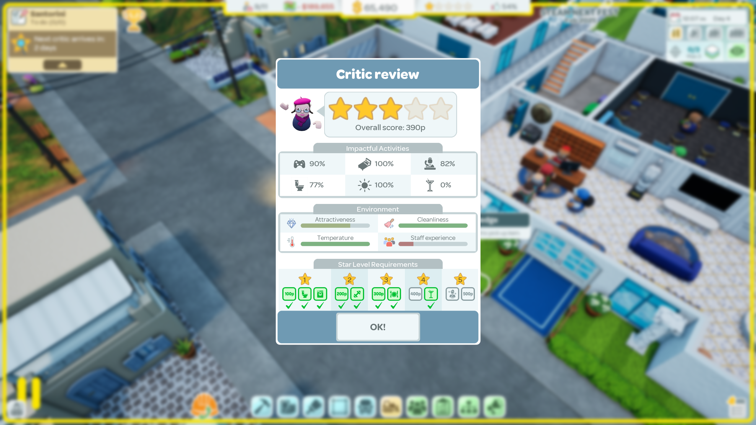 Slapping up a couple of paintings won’t cut it; these guests want quality and all the facilities - so make it happen hotelier! Remember your critic score can only go up by one star per visit, so 5 stars won’t simply happen overnight!