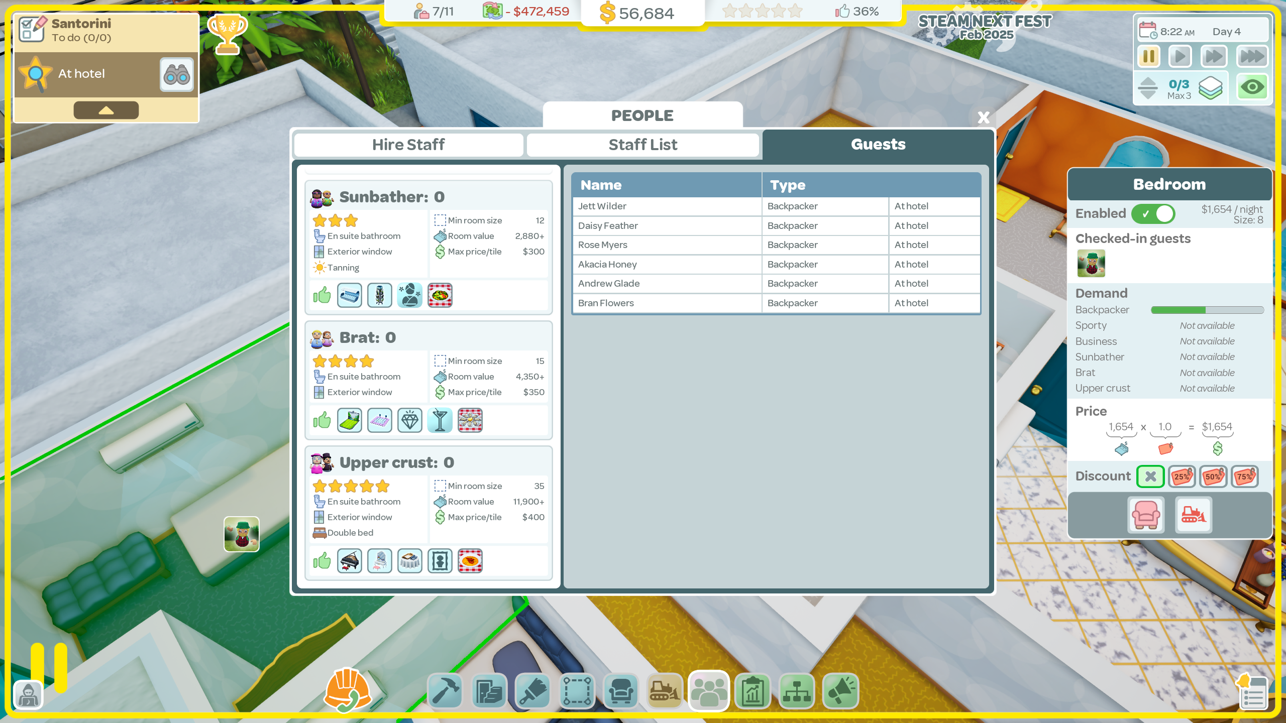 The best strategy? Start simple. Choose one guest type to focus on. Meet their minimum requirements, especially room setups and star level. Layer in the amenities they love to maximize satisfaction. Once that group is thriving, you can start expanding your appeal. Want to host both Sporties and Brats? No problem = just make sure your hotel has both a gym and a bar. Balancing guest types becomes easier once you understand how to overlap their preferences!