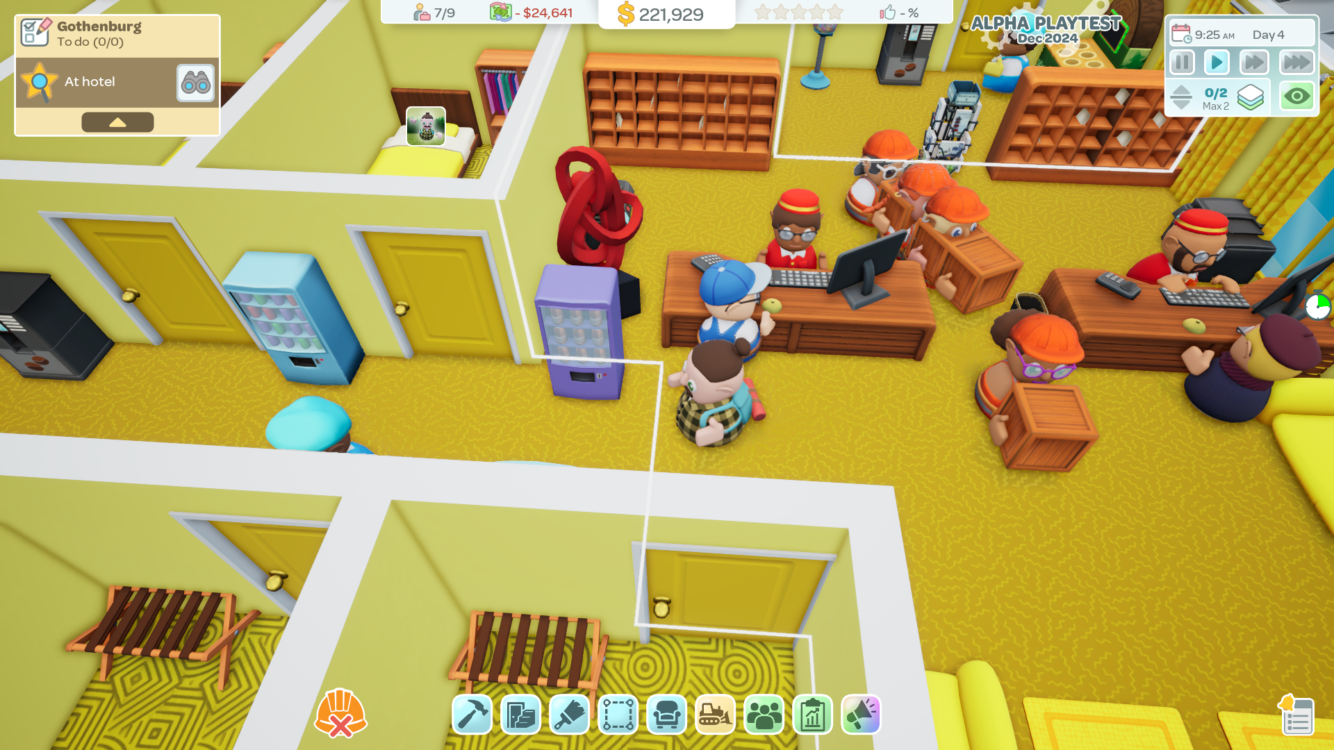 The Winter Playtest offers a sneak peek into Hotel Architect, letting you design, build, and manage your first Hotel in beautiful Gothenburg, Sweden. Once you have played the tutorial, you'll be able to unlock sandbox mode and go wild! This is similar to the closed playtest, however we have patched and improved upon your feedback, and made some well needed quality of life updates!