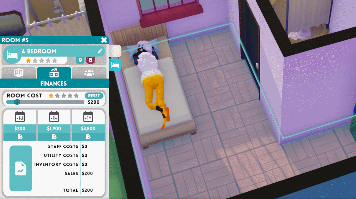 One of the biggest features you’ve been requesting is control over room costs for guests. We were already thinking this might be needed and, along with everyone’s early feedback, we decided this should be the first major update to the game after the Early Access Release. Now, you will be able to set the daily rate/cost of a room. Additionally, you will be able to set the default prices for bedrooms in relation to your hotel’s star rating (this makes things more streamlined).