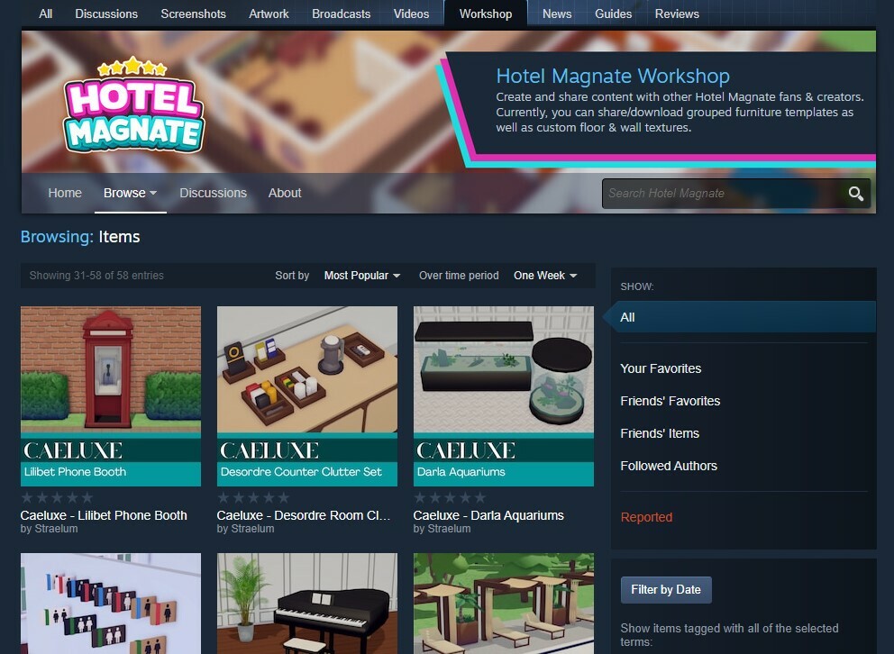 Dev's Choice: One bonus Steam Key for Hotel Magnate, Get one of your own furniture templates included in the game by default and get one of your templates or workshop items featured on the start menu for a month!